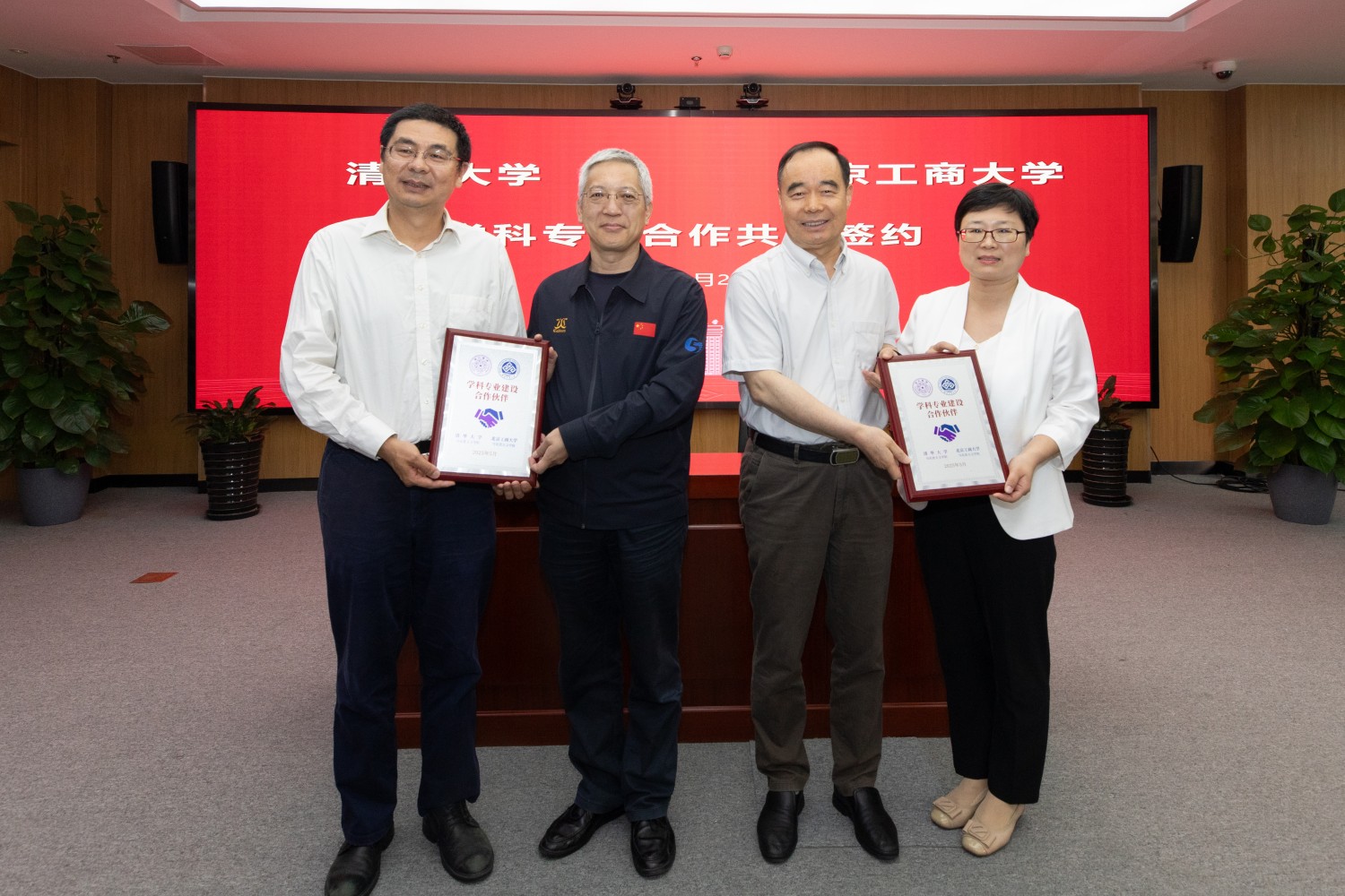 北京科技大學(xué)材料科學(xué)與工程學(xué)院黨委書記張秋曼和我校輕工科學(xué)與工程學(xué)院執(zhí)行院長翁云宣簽約;彭慶紅和鄭文紅為雙方頒發(fā)簽約紀念牌。