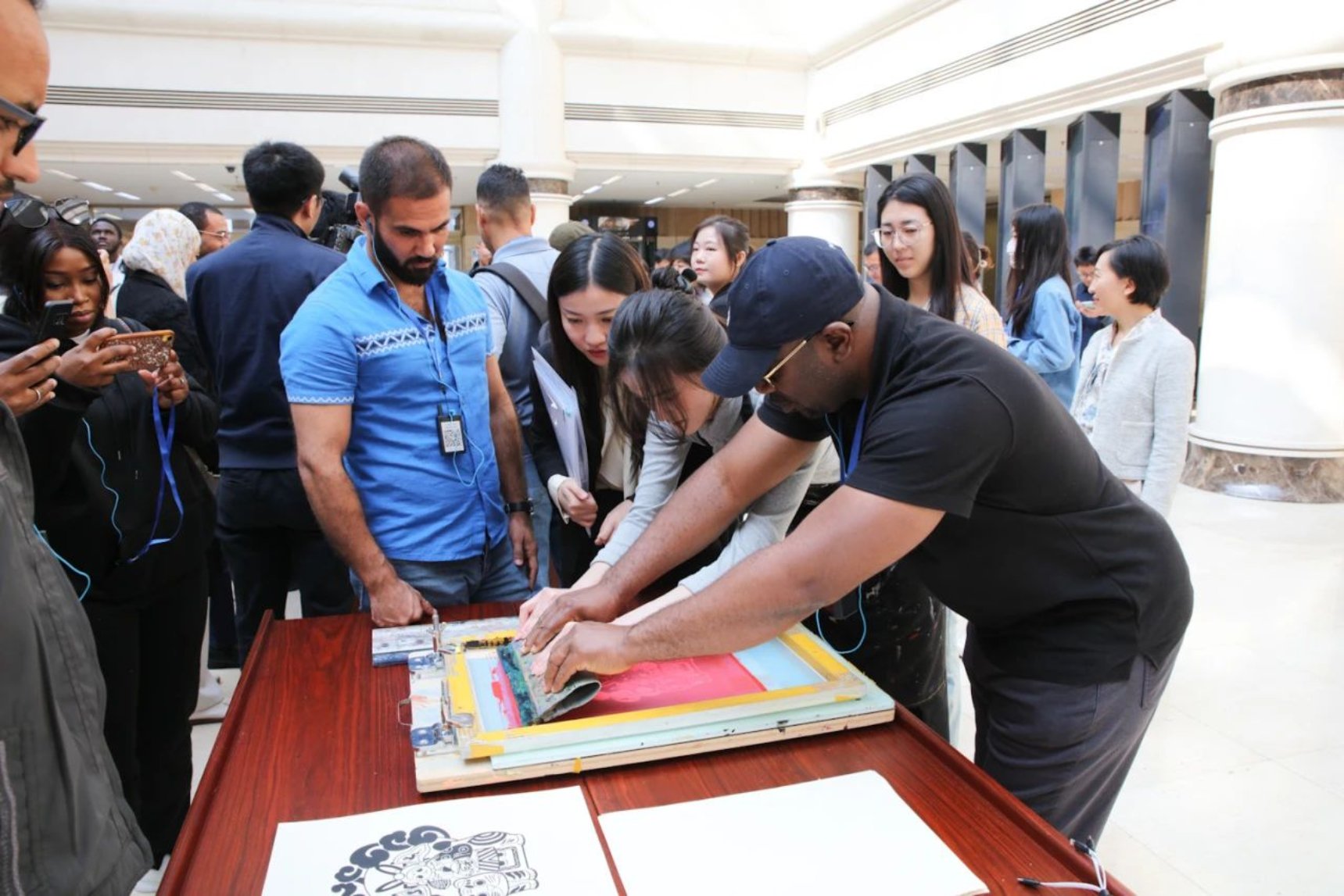 在圖書館大廳,記者們參加了“絲網(wǎng)印刷”文化體驗活動。傳媒與設計學院品牌設計方向的研究生將中國傳統(tǒng)經(jīng)典圖形圖案及北京經(jīng)典文化符號,以當代青年人的視角進行設計再創(chuàng)作,并與絲網(wǎng)印刷革新刷技術手段相結合,邀請記者們共同創(chuàng)作兼具古今文化藝術韻味的絲網(wǎng)版畫作品。當大家看到自己制作的成果時,都紛紛感嘆絲網(wǎng)印刷的神奇和中國傳統(tǒng)文化的魅力。