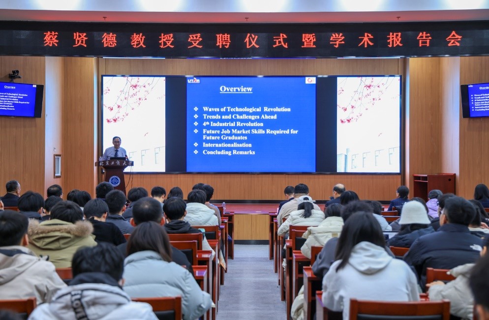 儀式后,蔡賢德教授為學校師生做了題為《Challenges and Opportunities for Future Graduates》的報告。蔡賢德教授的報告深入淺出,從技術革命浪潮、未來趨勢與挑戰、第四次工業革命、未來研究生需要的就業技能、國際化等方面介紹了未來研究生畢業后面臨的挑戰和機遇,引導在座的研究生在校期間既要夯實通識知識、形成分析思維、深耕專業領域,也要鍛煉團隊合作、管理、溝通、領導力、決策力等綜合素養,提出了2025年畢業生應具備的10項技能,帶給現場師生很大的啟發。