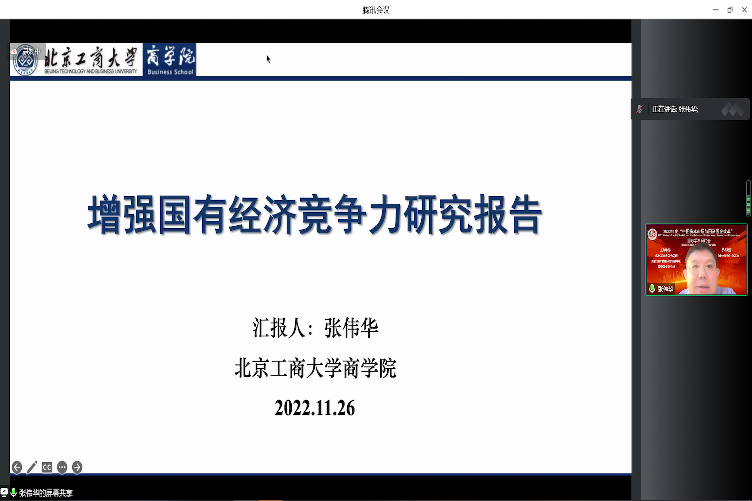 主題報(bào)告環(huán)節(jié),長(zhǎng)江講席學(xué)者、中國(guó)南方科技大學(xué)商學(xué)院曾曉亮教授以“ESG文獻(xiàn)發(fā)展和中國(guó)資本市場(chǎng)”為題,對(duì)ESG的研究進(jìn)行了全面的梳理,并分析了ESG對(duì)資本市場(chǎng)的影響。香港城市大學(xué)商學(xué)院陳旸旸教授以“Does Pay Transparency Affect Misconduct by Financial Advisers?”為題,探討了提高薪酬透明度是否能夠影響財(cái)務(wù)顧問(wèn)的不當(dāng)行為。北京工商大學(xué)原副校長(zhǎng)、國(guó)有資產(chǎn)管理協(xié)同創(chuàng)新中心主任、財(cái)務(wù)系教授謝志華以“價(jià)值共生與價(jià)值共享的時(shí)代”為題作報(bào)告。他指出,人類社會(huì)從工業(yè)時(shí)代發(fā)展到數(shù)字時(shí)代,實(shí)現(xiàn)了從行為變革到認(rèn)知變革的跨越。認(rèn)知變革促進(jìn)了人與人的平等,數(shù)字時(shí)代中公司制企業(yè)可以更好地實(shí)現(xiàn)價(jià)值共生和價(jià)值共享。我校財(cái)務(wù)系教授王斌以“股東資源:研究范式的轉(zhuǎn)換”為題,闡述了原創(chuàng)思想——股東資源論,股東資源論為中國(guó)特色公司治理和財(cái)務(wù)基礎(chǔ)理論研究提供一個(gè)全新范式,進(jìn)而可能開(kāi)啟一片全新的學(xué)術(shù)天地。商學(xué)院副院長(zhǎng)張偉華發(fā)布了國(guó)資國(guó)企研究院系列藍(lán)皮書(shū)《增強(qiáng)國(guó)有經(jīng)濟(jì)競(jìng)爭(zhēng)力研究報(bào)告》(2022)。報(bào)告指出,國(guó)有經(jīng)濟(jì)競(jìng)爭(zhēng)力在近年來(lái)不斷增強(qiáng),但同國(guó)際相比仍有差距。尤其是國(guó)有企業(yè)的技術(shù)創(chuàng)新能力相比國(guó)際水平還有很大差距,要多措并舉解決卡脖子的創(chuàng)新問(wèn)題。