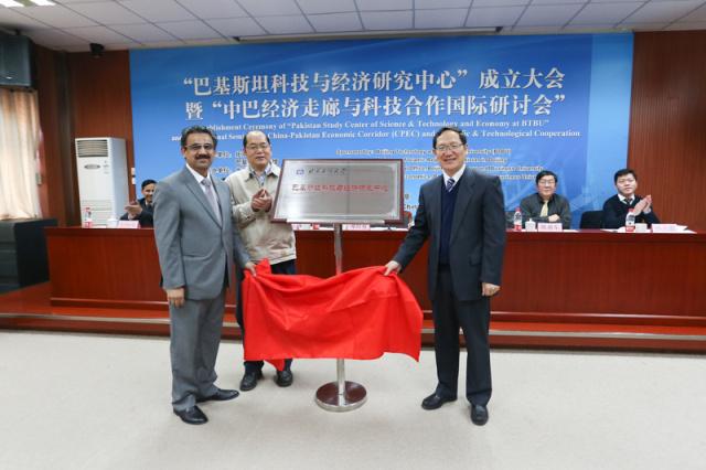 北京工商大學巴基斯坦科技與經濟研究中心1130日正式揭牌,并于當日召開“中巴經濟走廊與科技合作國際研討會”。北京工商大學黨委書記譚向勇、中國科學技術協會國際聯絡部副部長王慶林和巴基斯坦駐華大使館參贊松贊·阿巴斯(ShozabAbbas)出席會議并共同為巴基斯坦科技與經濟研究中心揭牌。