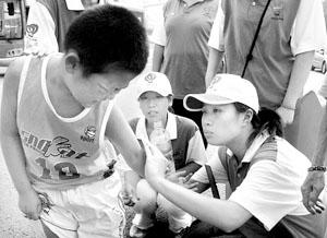 圖為奧運志愿者正在為受傷的小男孩處理傷口 攝/記者 張子淵