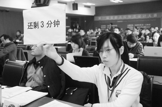 此次大賽共有中央財經大學、北京交通大學等20所高校的51支隊伍報名參加。最終決賽答辯日,24支決賽隊伍充分展示各隊的風采,為評委展示方案、回答評委提問,13名決賽專家評委在公平公正的原則上進行評分選優,評選出一、二、三等獎。圖為還有三分鐘時,工作人員舉牌提醒陳述隊員注意時間。