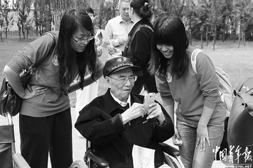5月19日,來自北京工商大學經濟學院的青年志愿者讓87歲的老華僑邵彤欣賞踏青時拍的照片。
