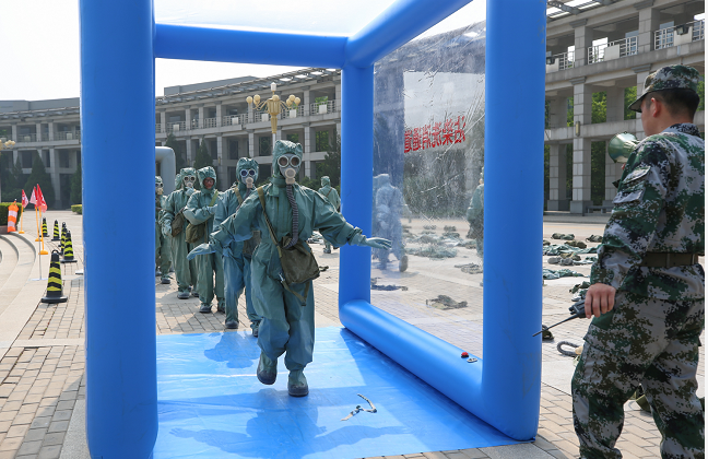 承擔此次組訓任務的天津某裝備公司負責人畢占東談到,“把有意義的訓練內容變得有意思,讓大學生能夠愿意主動參與、開心學習是我們開展高校核生化防護訓練課目設計的初衷。通過設定核泄露事故、化工廠爆炸事故、生物防疫三種真實發(fā)生在我們身邊的情境假設,讓學生在身臨其境環(huán)境下學習核生化防護知識,增強國防觀念和國家安全意識。”訓練按照訓前準備、課目下達、講解示范、個人體驗、分組練習、小結講評的步驟,在預設戰(zhàn)術背景和的模擬環(huán)境下,以模擬連為單位,依次完成穿戴防護服、穿越核沾染地帶、體驗核輻射劑量檢測、通過洗消通道、整理防護裝具的核防護訓練;穿戴個人防護裝具、快速通過病毒污染區(qū)域、解除個人防護及消毒的生物防護訓練和就便防護器材使用、快速通過化學污染區(qū)域、選擇逃生通道的化學防護技能訓練科目,實現全員額、全要素、全過程的核生化防護基本技能訓練目標。