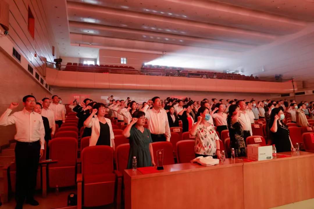全場黨員師生莊嚴肅立,面向黨旗,舉起右拳,在黃先開書記的帶領下重溫入黨誓詞,“我志愿加入中國共產黨……為共產主義事業奮斗終身,隨時準備為黨和人民犧牲一切,永不叛黨!” 錚錚誓言,字字千鈞,回溯精神根脈,賡續不變初心。