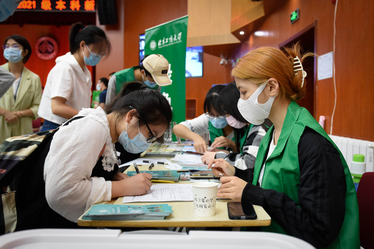各學院迎新工作現場也各具特色。數學與統計學院提前查看天氣情況作出相應的應急方案并預備多個迎新地點,同時邀請家長線上參加報到當天召開的學院師生見面會和專業介紹會,共同融入大學生活。食品與健康學院在迎新前通過線上直播的方式帶領新生們熟悉報到路線和校園環境,報到當天,特為新生設立“‘食’光郵局”,新生在信封中寫下大學四年的規劃與目標,期待大學四年后重新開啟,引導新生轉換角色、明確目標,激勵他們成長為更好的自己。輕工科學技術學院將專業教育前置,香料香精技術與工程專業今年第一次招生,系里選用研發的香精調配香水緊隨錄取通知書寄送每一位同學,讓新生直觀感受香料香精的魅力。學院組織80多名志愿者,提前與新生一對一精準對接,掌握新生到校時間和行李數量,全程陪伴新生報到。化學與材料工程學院在報到當天,號召已報到的2021級新生積極加入到迎新生志愿者隊伍中。學院領導、班主任和輔導員一同走訪了新生宿舍,叮囑新生要謹防電信詐騙,要做好宿舍建設,按照學校和學院要求認真完成新生教育。生態環境學院結合專業特色,用學生“六五環境日”環保書簽設計比賽的獲獎作品制作了明信片,新生在明信片上寫下對未來的寄語,引導新生從入學伊始熱愛環境專業,樹立為國家生態文明建設和生態環境保護奉獻的理想信念。人工智能學院特設科技展臺和展示板,向新生們展示今年來部分學科競賽獲獎作品和各專業前景等,為新生了解本專業做了詳細的準備。計算機學院設立了“揮灑青春,展望未來”主題的展板,為21級新生提供了記錄對大學新生活的愿景與自我寄語的平臺,讓同學們留下大學第一次落筆,記錄自己的成長。經濟學院特意為新生們架設了照相留念框、留言板,供新生們簽字留念,記錄下自己在北工商的“第一筆”。商學院特色吉祥物“商院虎”在門口歡迎新同學,老生志愿者穿著鮮黃色的老虎布偶服與新生們親切互動、合影留念;同時,學院將新生融入教育前置,提前征集了新生志愿者到校,與輔導員、老生志愿者一起做好迎新工作。國際經管學院暑期在公眾號推出“迎新特輯”9篇,“你好萌新”11篇,使新生提前了解校園環境、學院辦學特色,全力為新生保駕護航;安排新生們在假期之中給4年后的自己寫一封跨越時光的信箋,并在迎新現場設置了“時光郵局”信箱,讓小萌新親手將它投寄給4年后的自己。電商與物流學院通過“云班會”、學院公眾號、新生群等將迎新流程等事項通知到每位學生,并通過做好應急方案,迎新現場根據天氣變化,將報到地點轉移至室內,有條不紊開展迎新工作,學院還特別安排志愿者為新生拍攝照片,為新生報到留下美好回憶。法學院為新生劃分了報到時間段,確保報到不扎堆,服務更及時;學院吉祥物平平坐在桌子上歡迎新同學,學院還精心為每名同學制作了專屬登機牌,搭乘BTBULAWSCHOOL航班,開啟新征程!外國語學院設置了特殊的“朋友圈鼓勵板”,送上精心設計的學院LOGO口罩,以獨具匠心的方式歡迎新生。傳媒與設計學院作為北工商唯一招收藝考專業的學院,發揮專業優勢設計了5塊特色展板,以21級全體新生的名字組成了學院名稱,同時緊跟時事,把“銘記烈士、歌頌英雄”作為迎新宣傳主題,在歡迎新生的過程中貫穿愛國主義教育,傳承北工商愛國傳統,銘記歷史、保持初心。