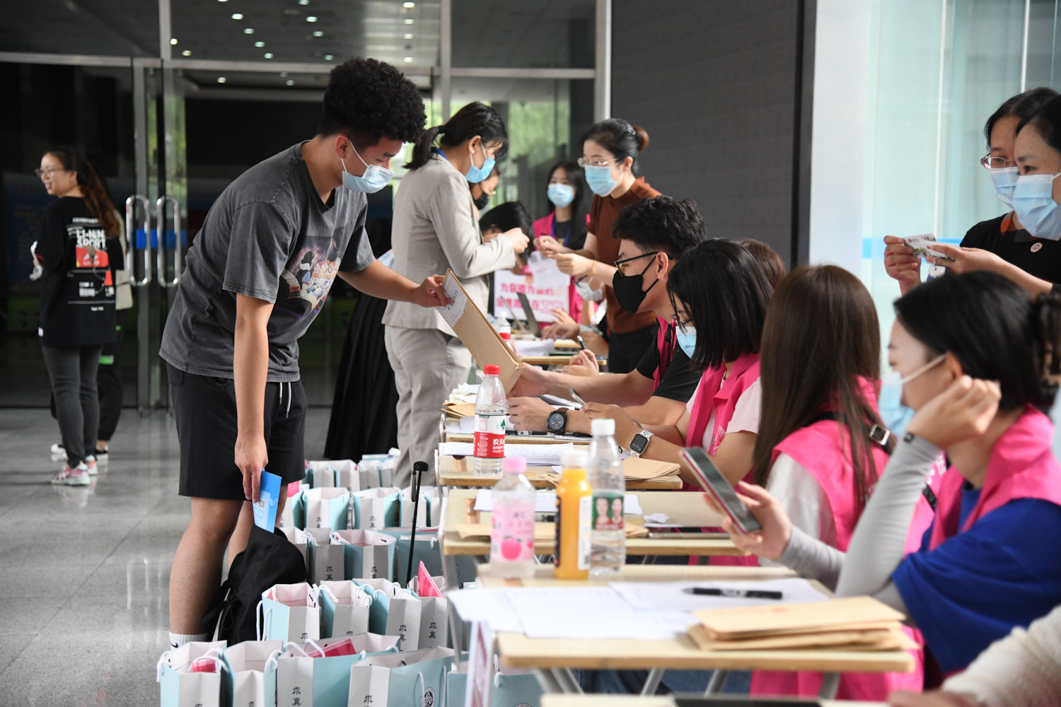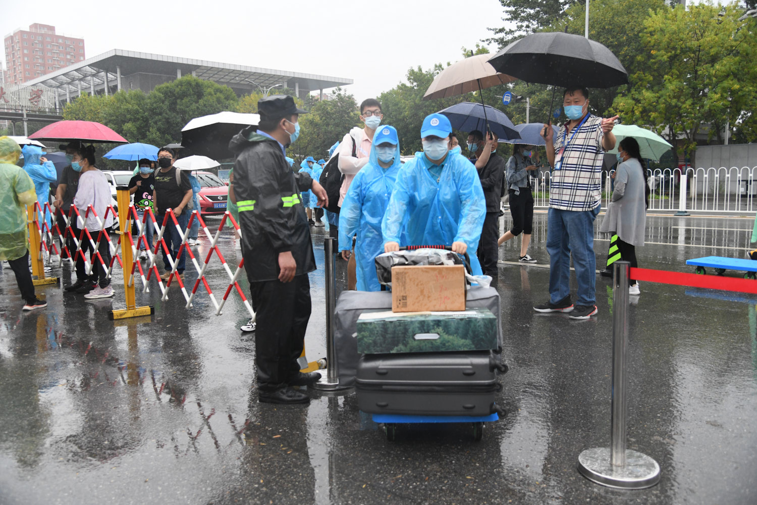 在迎新現場,LED屏幕顯示著新生們的報到情況,全國各地新生們編成一張“行程網”,來到共同的目的地—北京工商大學。因疫情防控要求,家長不能陪同新生入校,志愿者在校門口熱情迎接新生,幫忙搬運行李。在經過安保人員對入校新生的身份檢測、健康測溫、驗證健康綠碼和行程綠碼等操作后,志愿者將新生引導至各學院報到點。