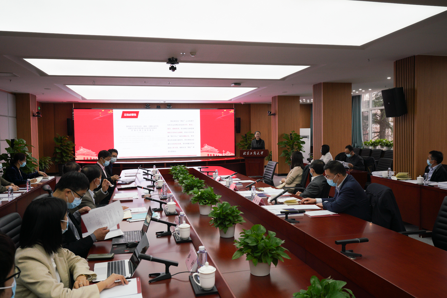 殷勇副市長肯定了學校在服務“兩區”體制機制改革所作出的貢獻,圍繞三個維度定位“兩區”建設、 “兩區”立法特點、法定機構實體三個方面闡述了“兩區”建設的舉措及思路,希望學校充分發揮智庫優勢,加快特色發展、開放發展,積極謀劃、充分調研推進“兩區”建設,以首善標準全面推進高水平研究型大學建設,為北京“兩區”建設貢獻北工商力量。