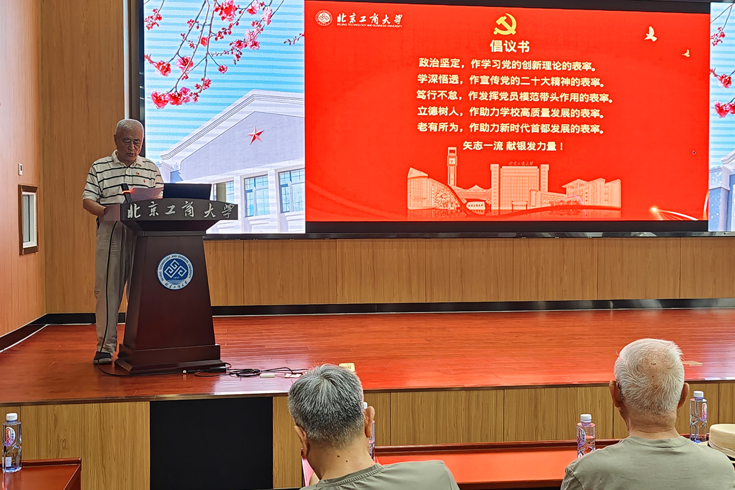 學校關工委副主任、學校本科教學督導專家組馬廷鈞宣讀了老黨員先鋒隊倡議書。他向學校離退休干部黨員發出倡議:一要政治堅定,作學習黨的創新理論的表率;二要學深悟透,作宣傳黨的二十大精神的表率;三要篤行不怠,作發揮黨員模范帶頭作用的表率;四要立德樹人,作助力學校高質量發展的表率;五要老有所為,作助力新時代首都發展的表率。他號召更多老黨員加入老黨員先鋒隊,進一步打造品牌隊伍。