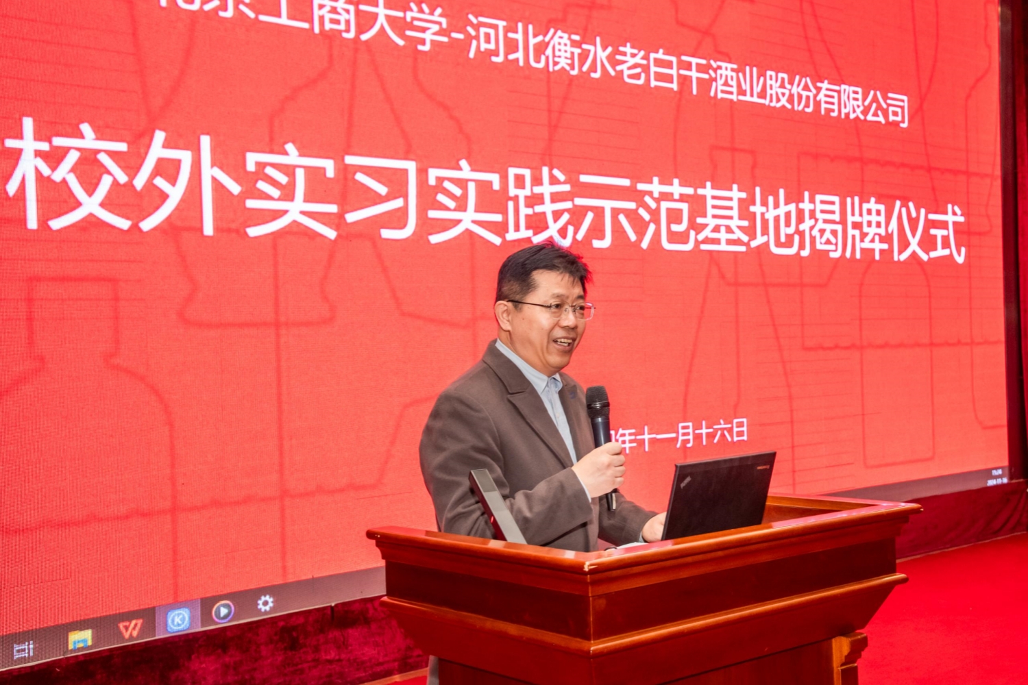 11月16日下午,校企雙方領導及參訓學員在酒都大廈多功能廳召開實踐活動啟動儀式,并進行了安全、文化與生產工藝等方面的培訓。參會人員共同觀看短片,對老白干的歷史文化和釀造工藝有了初步了解。張金光和鄭福平分別代表企業與學校致辭,張金光回顧了雙方多年合作的歷程,期待北京工商大學為老白干企業輸送更多優秀的人才,鄭福平介紹了釀酒工程系人才培養的特色,也表達了對雙方繼續加強合作的期許。雙方代表張金光、王新磊與孫嘯濤、孫金沅共同為“北京工商大學-河北衡水老白干酒業股份有限公司校外實習實踐示范基地”揭牌,與會人員共同見證這一重要時刻。