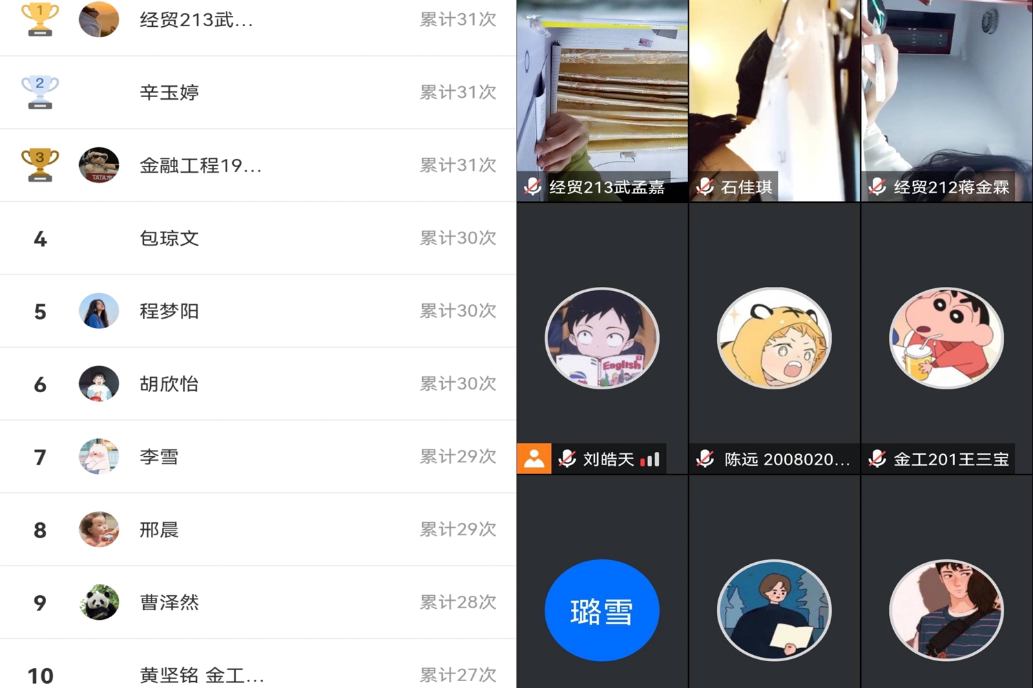 5月,為提高線上學習效率,學院線上開展“與努力的你相遇——經(jīng)濟學院云端自習室”線上自習活動。在活動期間,學院經(jīng)英學子積極參與,自習平均自習時長為1小時40分,累計打卡百余次,相互監(jiān)督的新穎模式充分提升了同學們學習的專注度和學習效率,百花齊放的線上學習氛圍彰顯了經(jīng)院學子自律、自強的良好學風!