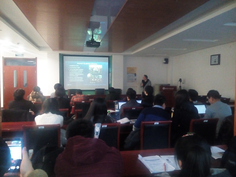 Luc Renambot教授由電影《星球大戰(zhàn)》講起,介紹了其所在的電子可視化實(shí)驗(yàn)室在可視化與虛擬現(xiàn)實(shí)方面的研究,介紹了三代虛擬現(xiàn)實(shí)設(shè)備以及三代可視化設(shè)備,包括CAVE, StarCAVE和CAVE2,以及大數(shù)據(jù)時(shí)代下的可視分析方法,處理大規(guī)模數(shù)據(jù)的有效措施,并通過(guò)圖片和視頻向大家展示絢麗的可視化交互效果和虛擬現(xiàn)實(shí)技術(shù)。引起現(xiàn)場(chǎng)聽(tīng)眾的濃厚興趣。Luc教授的講解詳細(xì)生動(dòng),現(xiàn)場(chǎng)氛圍十分活躍。