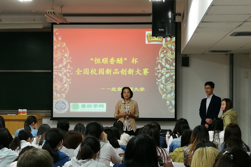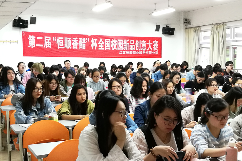宣講會(huì)上,田波簡(jiǎn)述了恒順醋業(yè)的發(fā)展歷程、產(chǎn)業(yè)規(guī)模、產(chǎn)品創(chuàng)新及所獲榮譽(yù)。接著田波對(duì)此屆創(chuàng)意大賽的主題、參賽要求、獎(jiǎng)項(xiàng)設(shè)置、大賽流程及評(píng)審標(biāo)準(zhǔn)等內(nèi)容作了詳細(xì)闡釋,并顯示了上屆比賽的部分優(yōu)秀作品。在互動(dòng)環(huán)節(jié),田波工程師與現(xiàn)場(chǎng)同學(xué)進(jìn)行了親切互動(dòng),探討了中國(guó)四大名醋的異同點(diǎn)以及其他食品行業(yè)知識(shí)。胡燕霞做總結(jié)發(fā)言,鼓勵(lì)同學(xué)們積極參與比賽,并預(yù)祝同學(xué)們?nèi)〉脙?yōu)異成績(jī)。