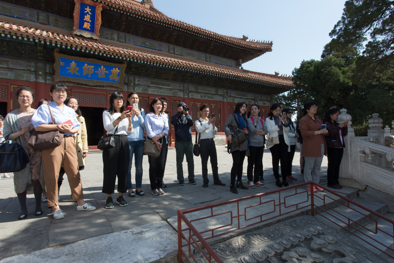 北京孔廟作為全國規格最高的孔廟,是元、明、清三朝皇帝舉行國家祭孔的場所。在孔廟,大家參觀了古建筑群體三進院落的先師門、大成門、大成殿、崇圣祠、碑亭等。孔廟建筑宏偉,院內紅墻黃瓦,古樹參天,古樸幽靜。在孔子牌位供奉處——大成殿前,康熙書寫的“萬世師表” 的匾額分外醒目,讓人對先師孔子更加肅然起敬,老師們紛紛合影留念。老師們還觀看了大成禮樂特色演出,演出集樂曲、樂舞、吟誦三位一體,將孔子的“禮教”與“樂教”結合,在莊嚴肅穆的氛圍中傳遞著“以禮修身、以樂感人”的藝術宗旨,使老師們再次感受到中國傳統文化之美。