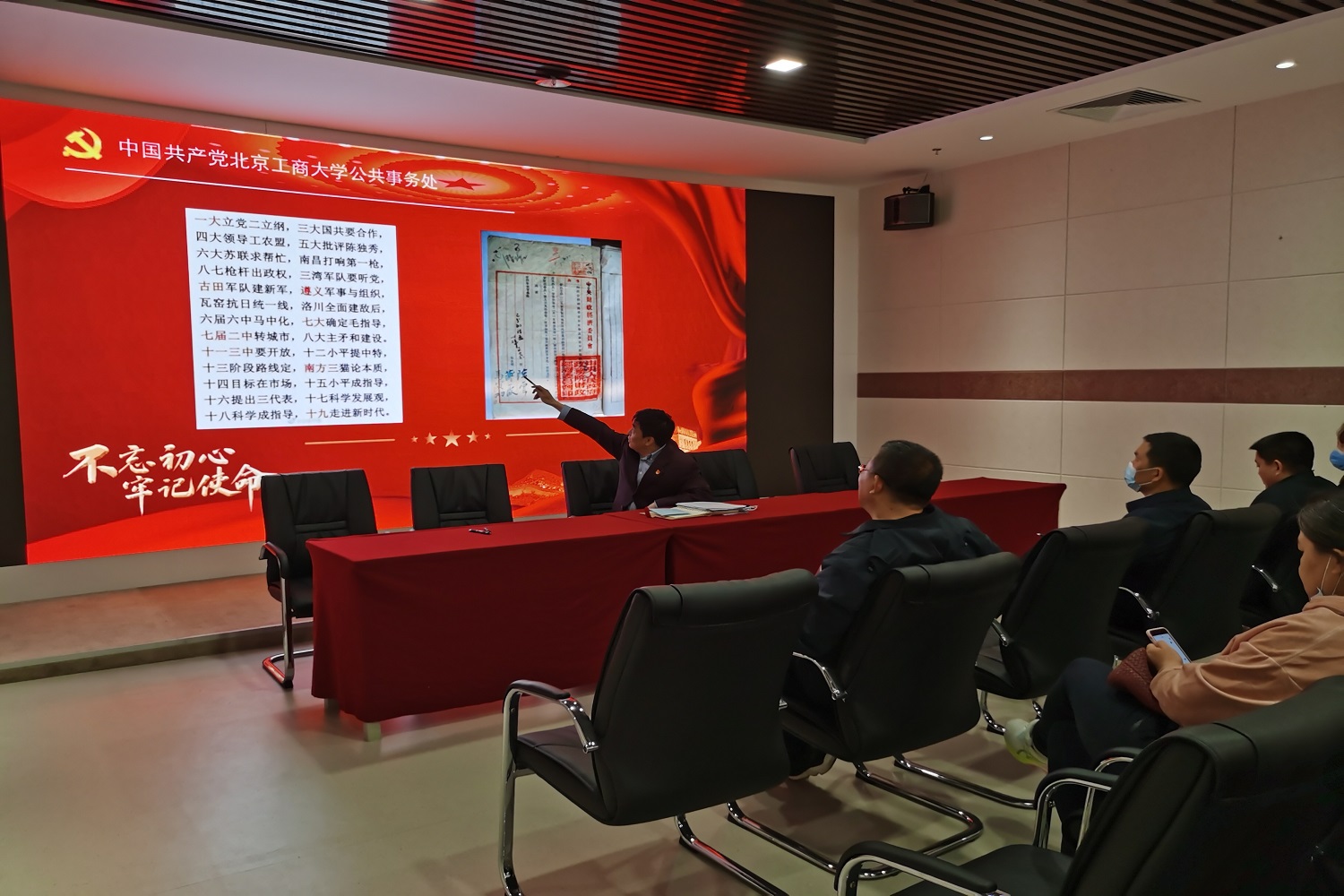 黨課上,張曉磊說:紅色基因是北京工商大學(xué)發(fā)展源源不竭的動(dòng)力。北京工商大誕生于新中國成立之際,成長于國家和民族奮進(jìn)之中,發(fā)展于國家和民族振興之時(shí)。他從組成北工商的三所學(xué)校講起,介紹三所學(xué)校作為行業(yè)院校的光輝歷史,通過他的講解把學(xué)校建校70年以來“立學(xué)為民”、“學(xué)而為國”的歷史脈絡(luò)完整呈現(xiàn)。學(xué)校的發(fā)展歷程,是新中國高等教育發(fā)展的一個(gè)生動(dòng)縮影。北京商學(xué)院、北京輕工業(yè)學(xué)院相距在原前身的基礎(chǔ)上成立于1958年中國高校建設(shè)高峰期,又相距的1969年、70年停辦和外遷;又在1978年、1979年相距復(fù)辦和重建;在1999年北京商學(xué)院、北京輕工業(yè)學(xué)院合并,機(jī)械工業(yè)管理干部學(xué)院并入組建北京工商大學(xué),加上2004年成立北京工商大學(xué)嘉華學(xué)院,完整的展現(xiàn)了我國高等教育的發(fā)展史。北京工商大學(xué)70年來扎根中國大地,秉承“求真 立德勤奮 創(chuàng)新”的校訓(xùn),與祖國共進(jìn)、與時(shí)代同行,學(xué)校各項(xiàng)事業(yè)不斷取得令人矚目的成就,形成了本科生、碩士生、博士生及博士后,從全日制到成人教育、留學(xué)生教育全方位、多層次的辦學(xué)格局和教育體系,為國家培養(yǎng)了15萬余名社會(huì)主義事業(yè)建設(shè)者和接班人。通過對(duì)學(xué)校歷史的介紹、照片的展示,讓公共事務(wù)處的黨員們對(duì)北工商具備的紅色基因和精神有了更為直觀和深入的了解。