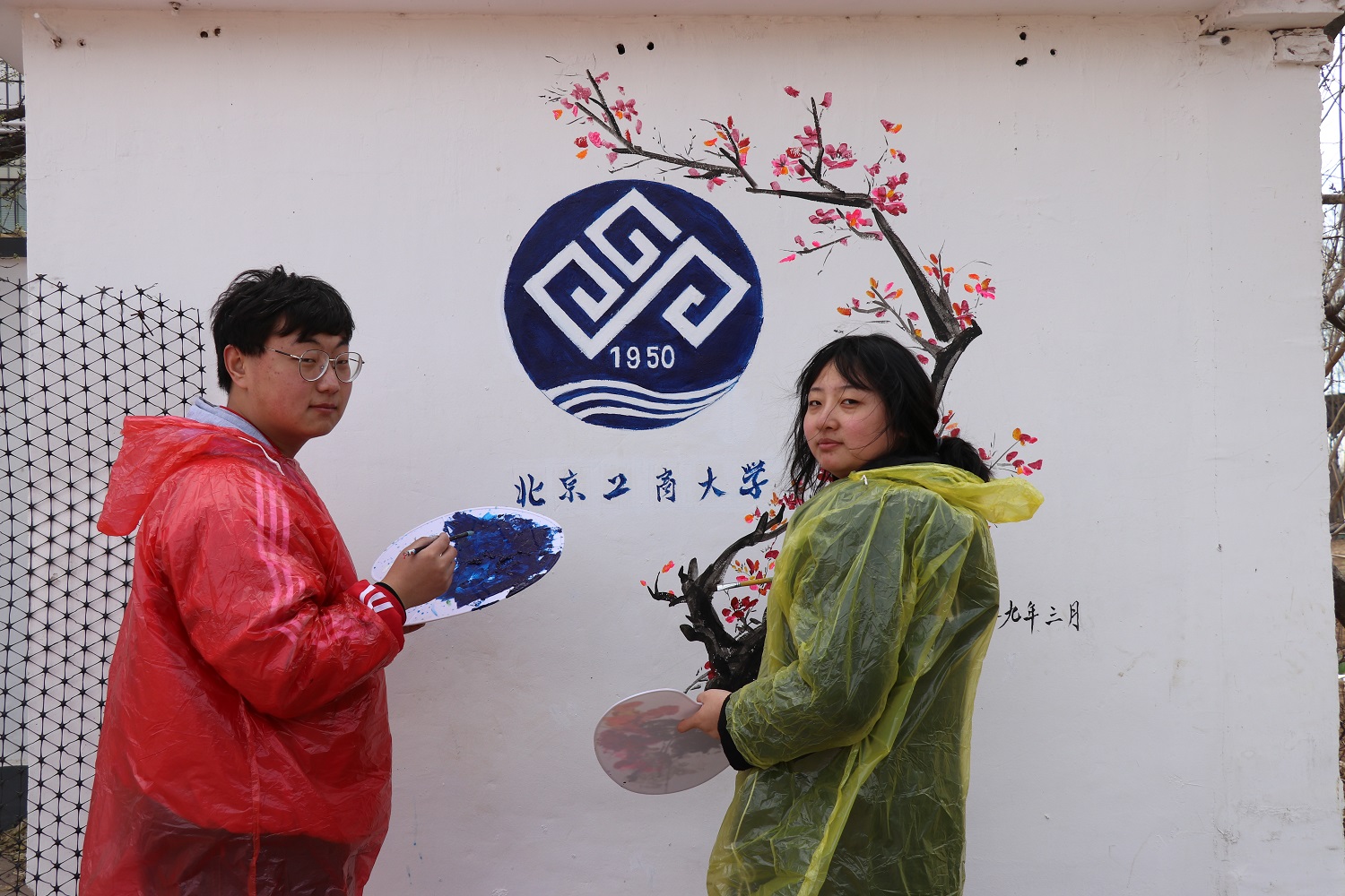 蘸滿藍色顏料的筆刷,為畫中的藍天涂上了最后一筆。北京工商大學深藍色的校徽與畫中的綠水青山融為一體。縱使風沙再大,同學們的手上、衣服上、甚至頭發上都沾上了各種顏色的顏料,但他們看向“重獲新生”的文化墻、看向彎腰清洗筆刷的徐亮老師、看向認真欣賞墻繪的村民們,內心更多的是成就感。