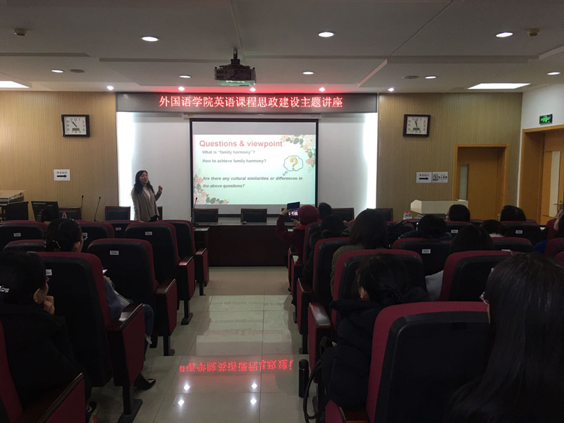 李丹丹以她參加的一次《大學英語》課程思政教學設計為案例《Family Harmony》,展示了如何把中國文化家庭價值觀無痕融入教學,激發學生思考與討論,“家是最小國,國是千萬家(Home is the smallest country, and the country is tens of millions.)” ,家庭和睦則社會安定,家庭幸福則社會祥和,家庭文明則社會文明,把愛家和愛國統一起來,提升學生中國文化歸屬感和自信感。