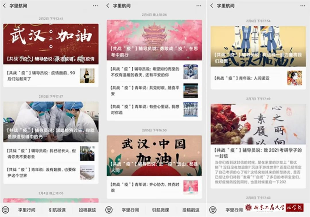 輔導員尹航依托“字里航間”輔導員網絡思政工作室,發布 “輔導員說”、“青年說”原創文章25篇,提醒學生們強防護、不恐慌、信科學、不傳謠,將防疫與思政育人相結合,并于公眾號中推出“共戰疫”系列活動,以散文,詩歌,海報等形式為疫情發聲。引導學生堅定理想信念,擔當抗“疫”宣傳員。