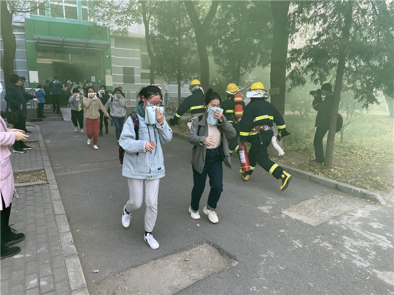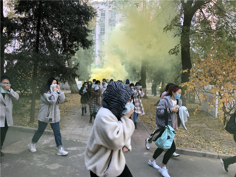 演習現場井然有序,參與師生簽到、領取消防毛巾后,演習正式開始,保衛人員在彤程樓東西側門內外及樓前廣場共投放了5顆模擬煙霧彈,隨著煙霧升騰,樓內報警聲響起,參加演習的師生按照培訓要求,戴好口罩,捂住口鼻,彎腰俯身,有序從距離崗位最近的安全門撤離,5分鐘后,參演師生全部順利逃離彤程樓“火災”現場。