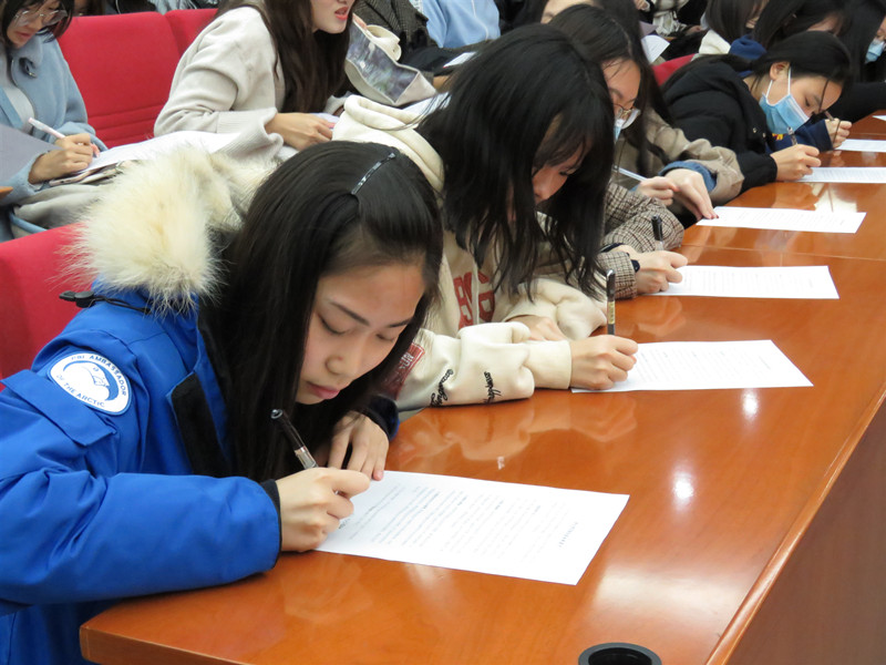 會上,經(jīng)濟(jì)學(xué)院輔導(dǎo)員路京明宣讀《關(guān)于2020年度經(jīng)濟(jì)學(xué)院黨員宿舍和黨員床位掛牌的決定》。各位黨員在“學(xué)生黨員聯(lián)系宿舍承諾書”上簽字,承諾充分發(fā)揮學(xué)生黨員的先鋒模范作用。馬靈清代表我院學(xué)生黨員發(fā)言,她表示要堅(jiān)定共產(chǎn)主義理想信念;明確自身職責(zé),加強(qiáng)服務(wù)群眾的能力;做表率,樹先鋒,用實(shí)際行動(dòng)擦亮黨員先鋒底色。向小平和尹皓霙倢兩位老師向各支部學(xué)生黨員代表發(fā)放黨員宿舍掛牌。各位黨員、預(yù)備黨員重溫入黨誓詞,一句句錚錚誓言,表達(dá)了自己不忘初心跟黨走的決心。