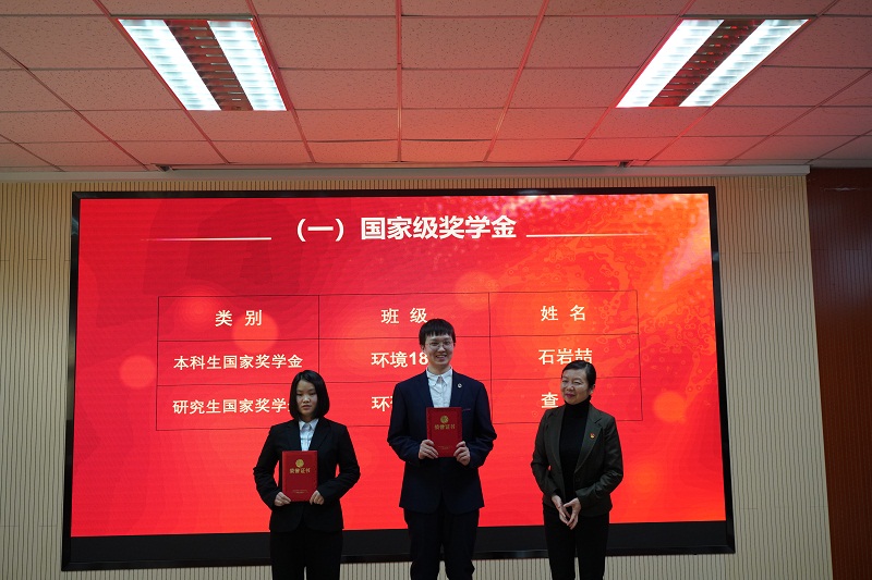 國家獎學金獲得者、環境182班石巖喆發言,他從健康的體魄、學習與能力關系、人格與道德品質、機遇和挑戰等方面分享了在校期間的感悟,鼓勵學弟學妹們勤奮學習,不負韶華,書寫屬于自己的人生篇章。環境202吳茜倫作為新生代表發言,她代表新生對獲獎學長學姐們表示祝賀,表示會堅定信念,努力學習專業知識,積極參加環保宣傳與科普,以學長學姐們為榜樣,努力學習,不負期望,擔起時代重任。