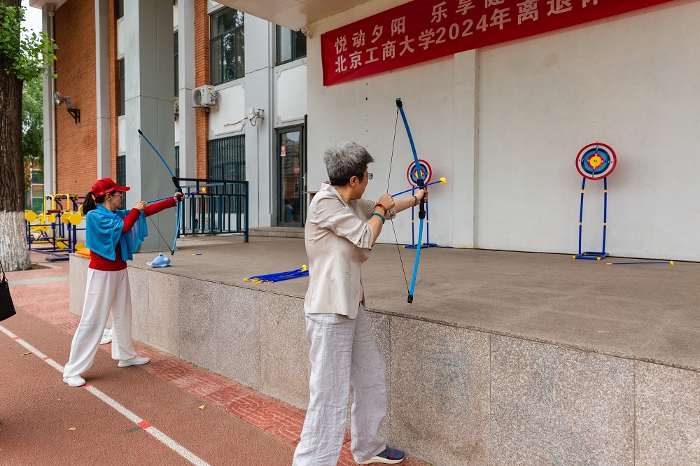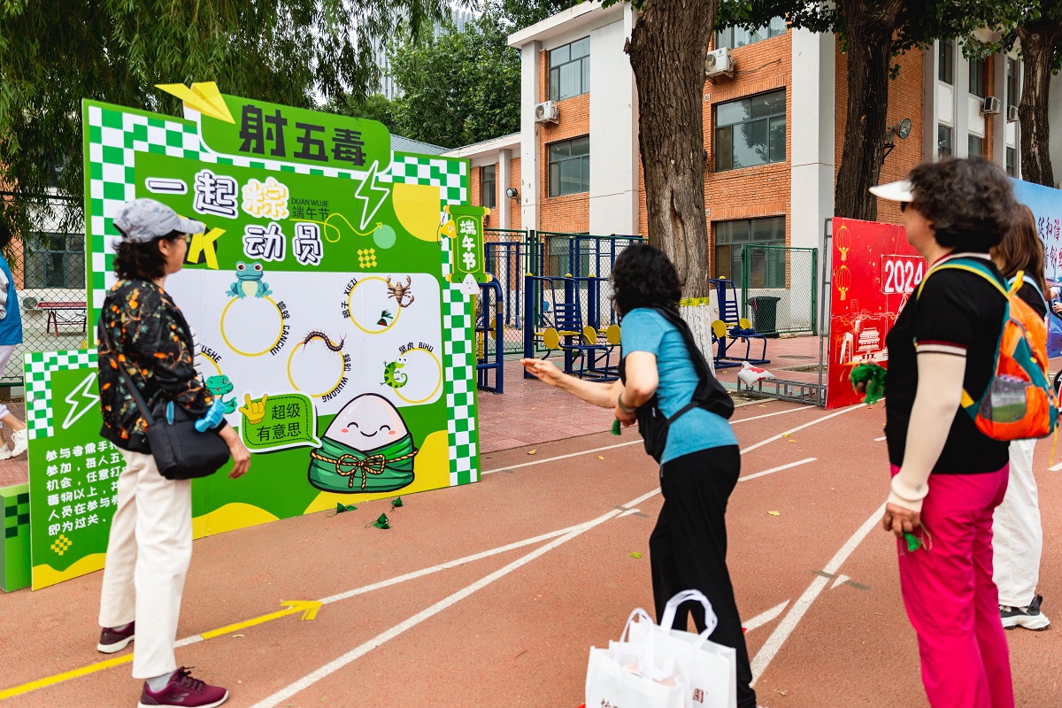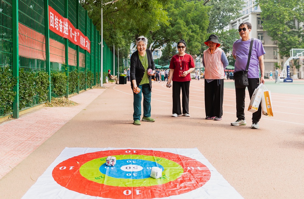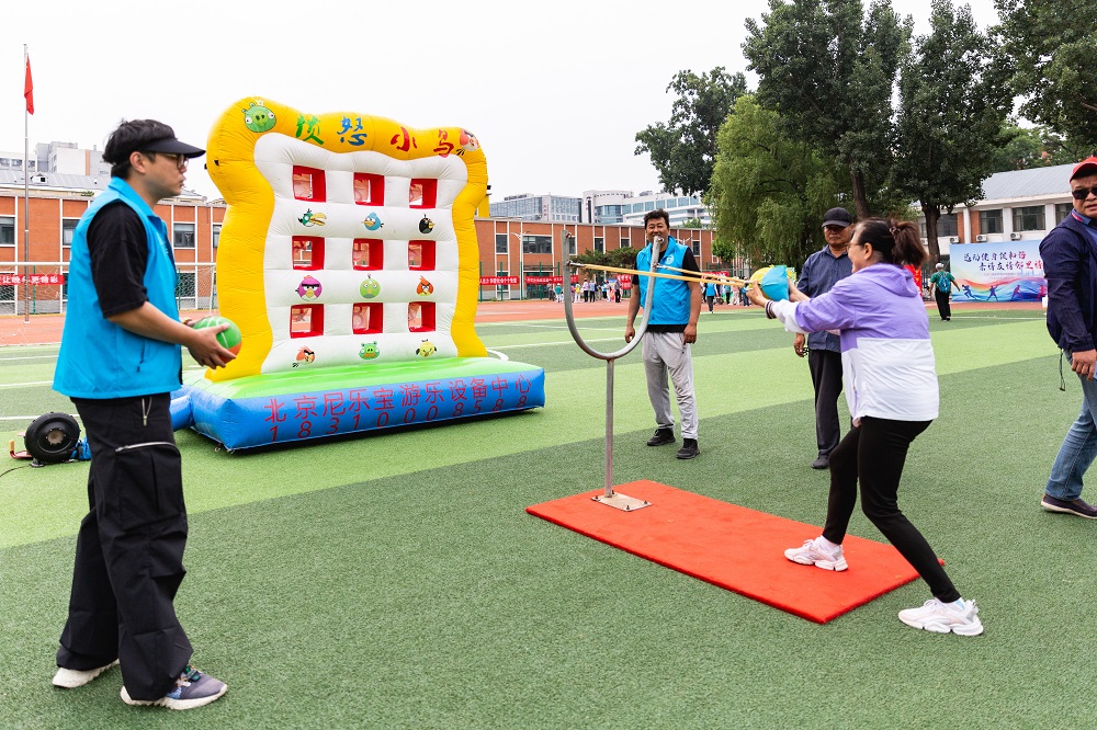 本次活動的主體項目是精心設計的趣味運動,讓每位參與者都能在輕松愉快的氛圍中享受運動的樂趣。“筷子夾球”項目需要在最短的時間內(nèi)用筷子夾出乒乓球再放入指定位置,鍛煉老年人的手指靈活度?!白闱蝻w鏢”“沙包擲準”“冰壺”“動感單車”鍛煉老年人的四肢精準度和力量?!巴都雺亍薄拔P射箭”、端午節(jié)民間傳統(tǒng)游戲“射五毒”“捶丸”既體現(xiàn)了傳統(tǒng)文化,又結(jié)合了現(xiàn)代技術,為健康運動增添了科技感。“木球攻門”“套圈尋寶”既考驗了策略思考,又增加了運動的趣味性。模仿游戲角色用彈弓將小鳥射向小豬的項目“憤怒的小鳥”充滿童趣,吸人眼球,既考驗參與者的力度控制,又激發(fā)了競技激情。“抓娃娃”讓老同志回到了童年時光,感受到滿滿的童趣。豐富的趣味運動項目寓意“點亮北京”,老同志們在參與中提高了健康理念,增添了生活樂趣,增強了為首都增光添彩的良好心愿。