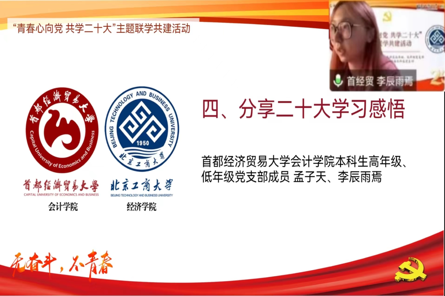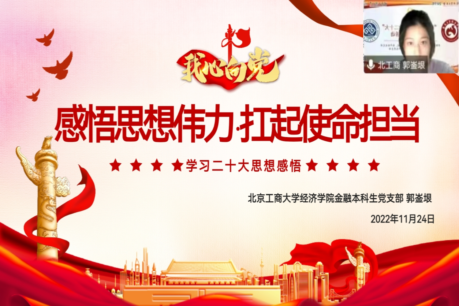 首都經濟貿易大學會計學院孟子天、李辰雨焉、北京工商大學經濟學院郭崟垠分別代表各支部分享了二十大學習的感悟。孟子天表示,我們青年一代應該矢志不渝跟黨走,不忘初心、牢記使命、謙虛謹慎、艱苦奮斗,在新時代的長征路上勇毅前行。李辰雨焉表示,青年人應當把學習作為首要任務,不僅要學習黨章黨史,還要學習專業知識。郭崟垠則表示,黨的二十大是一次十分重要的大會,總結了十年來的成就和經驗,要切實學懂弄通習近平新時代中國特色社會主義思想,擔當起譜寫馬克思主義中國化時代化新篇章的莊嚴歷史使命。