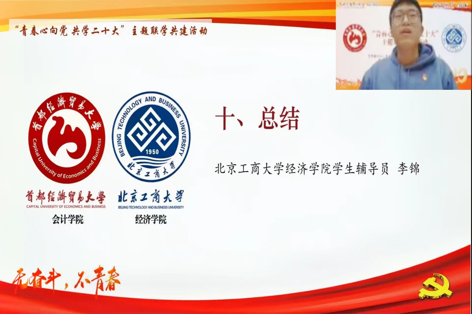 北京工商大學經濟學院學生輔導員李錦在總結中表示,這次活動促進了校際間支部共建的深度融合、深化了學生黨建工作的交流合作、創新了黨員教育模式。兩個支部有很多的共通性,有很強的學習與合作的空間,期待與會計學院本科生黨支部并肩前行,堅定不移聽黨話、跟黨走,努力成為有理想、敢擔當、能吃苦、肯奮斗的新時代青年!