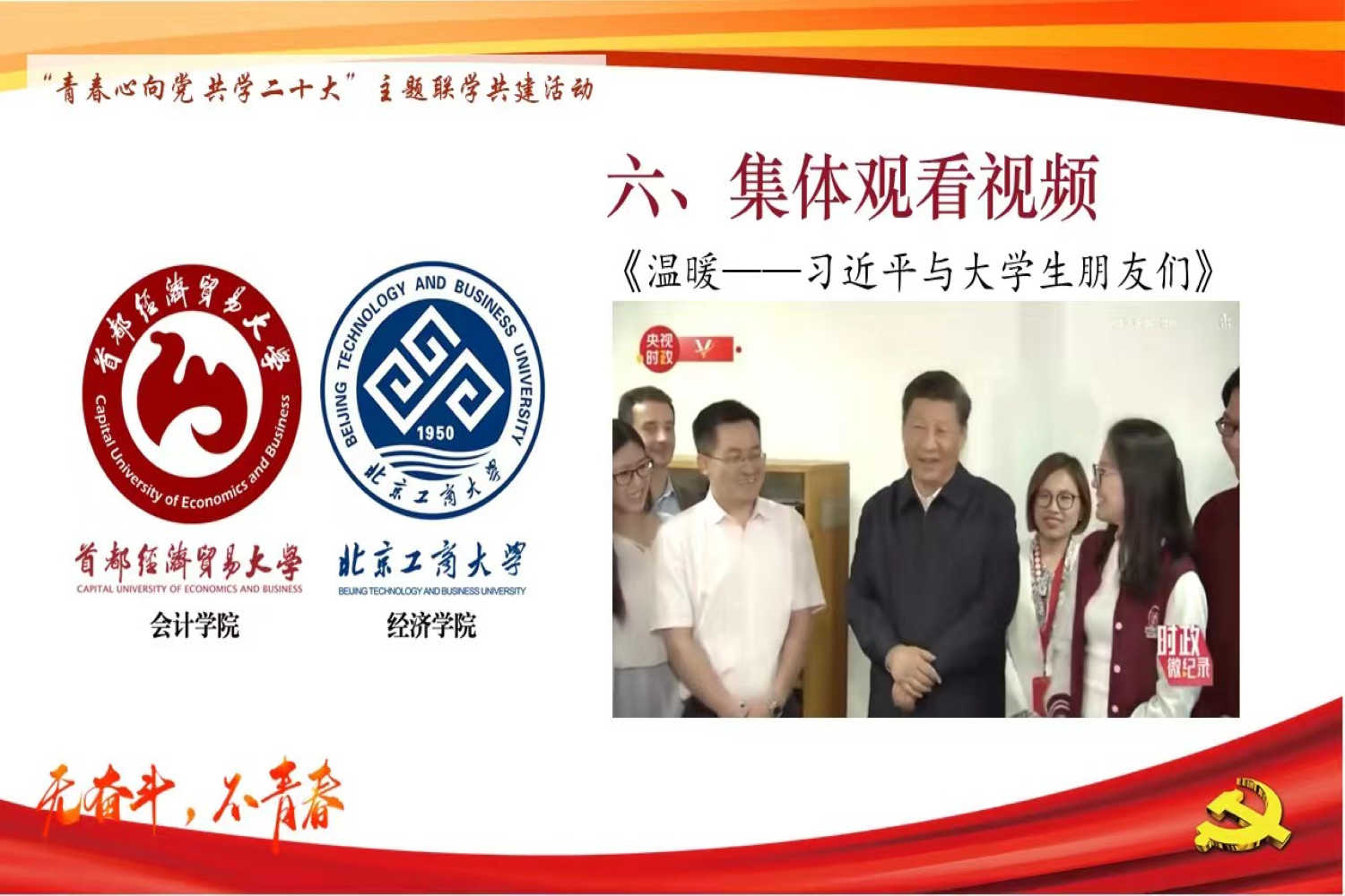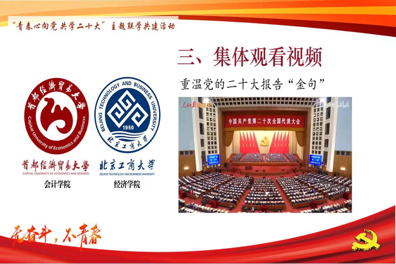 本次聯學共建活動共分為“青春獻禮二十大”和“踔厲奮發心向黨”兩個篇章。開篇,北京工商大學經濟學院金融本科生黨支部書記鄒雪婧與首都經濟貿易大學會計學院本科生高年級黨支部書記閆麗分別介紹了各支部的人員組成、主要成果與未來目標。