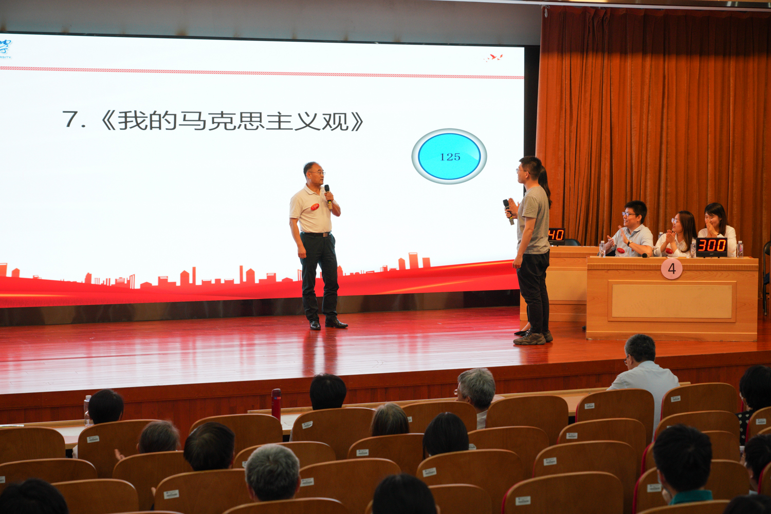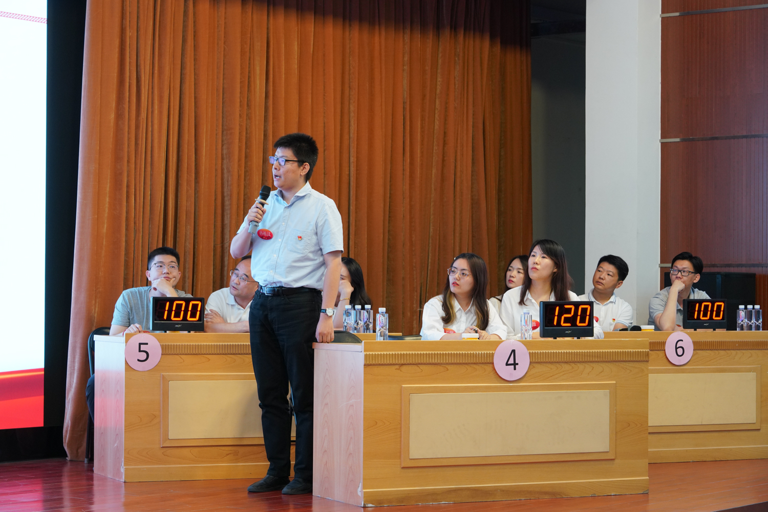 經過前面兩個環節的激烈角逐,比賽也進入了白熱化,第三輪“知難而進”為風險題環節。各隊都迎難而上,優先選取高分題目挑戰。占盡領先優勢的第4隊第一題即抽中了背誦毛澤東主席的詩詞《七律·人民解放軍占領南京》,來自紀檢監察黨支部的選手孫棟漢流暢完整并充滿感情的的背誦將現場氣氛烘托到了高潮,贏得臺下觀眾的一片喝彩聲。