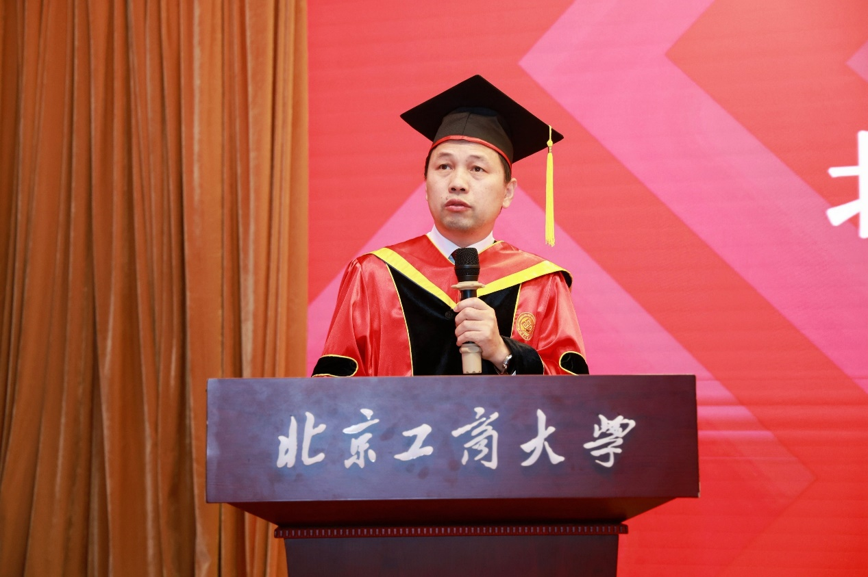 寇紅江代表學校向全體畢業生和畢業生家長表示最熱烈的祝賀和最美好的祝愿。他表示,過去的幾年里各位青年學子與學校一同成長,共同見證了學校的蒸蒸日上,同學們在學術探索上追求卓越,勇攀高峰;在社會服務中錘煉品格,磨礪意志;在團隊拼搏中學會合作,攜手成長;在逐漸成熟中感悟人生,學會感恩。同學們用自己的青春和熱情,為學校和學院注入了無限的活力,也為父母和家庭帶來了蓬勃的希望。寇紅江叮囑畢業生要不忘初心使命,在未來的道路上不斷實踐,成為國之棟梁。他告訴畢業生們,畢業不是結束而是新的起點,北京工商大學永遠是同學們的溫暖港灣和堅強后盾,歡迎常回家看看。