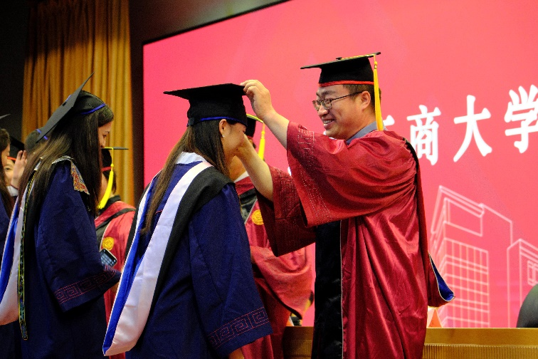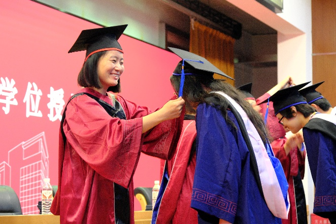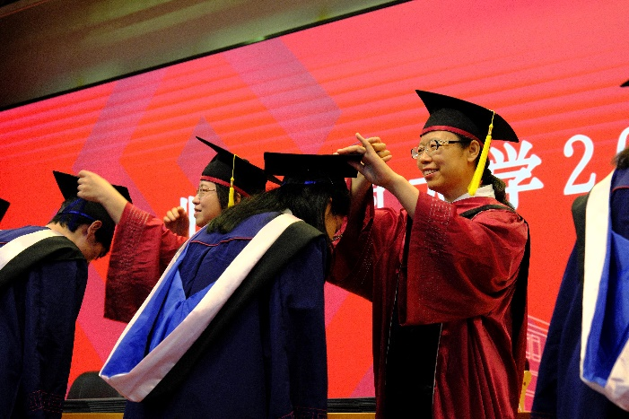 畢業生們依次上臺,由劉影書記,王擎院長,張慧子副院長,史巖林副院長為同學們頒發畢業證書和學位證書,撥蘇正冠。