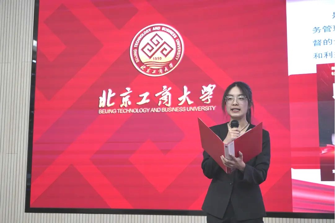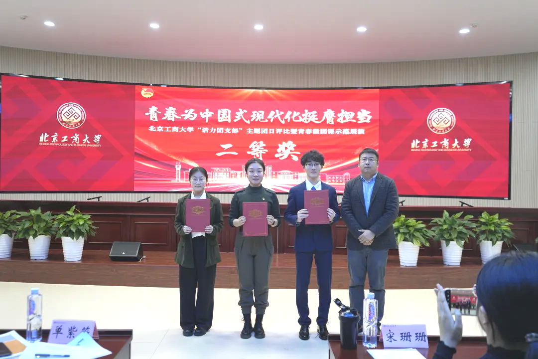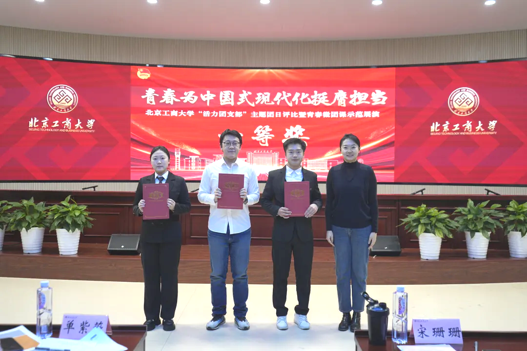 北京中醫藥大學團委書記宋珊珊為一等獎獲獎支部代表頒獎。獲獎支部為:輕工科學與工程學院環境工程231團支部、計算機與人工智能學院自動222團支部、商學院注會222團支部。