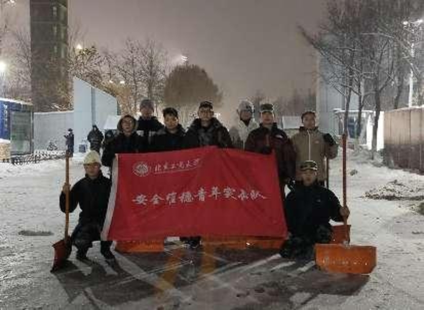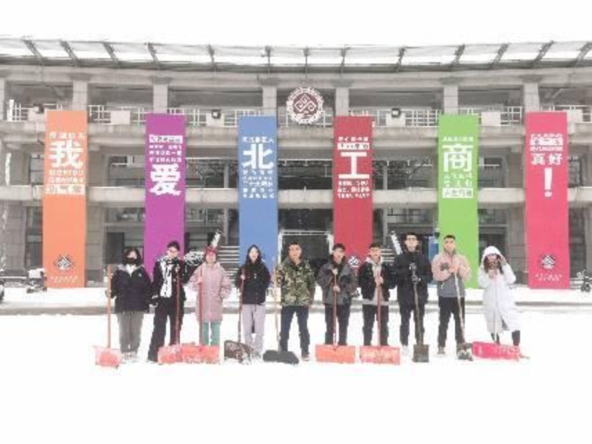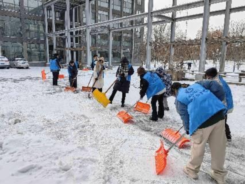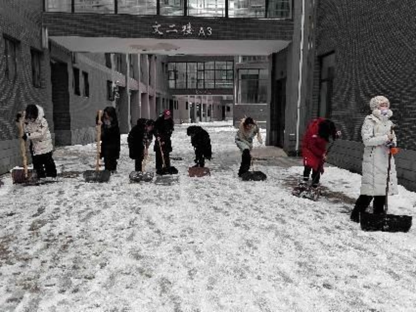 在學院的帶領下,學生志愿者也積極行動起來,開展掃雪除冰勞動實踐。學生們拿起除雪工具,推、鏟、揚、堆,各種方法齊上陣,有條不紊地將學院樓宇門口和道路上積雪路面逐一清理干凈,讓青春閃耀在冰雪世界,將愛與溫暖傳遞在校園的每個角落。