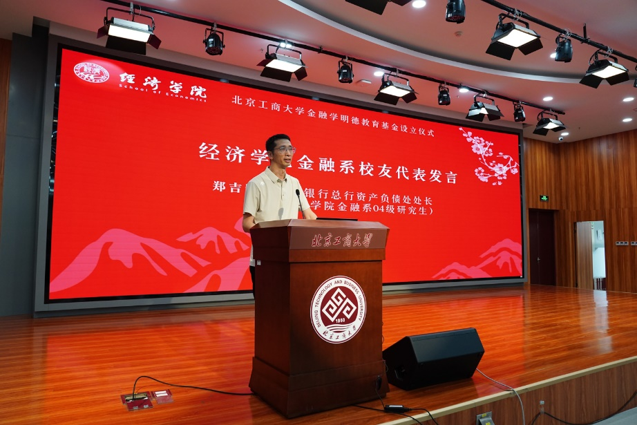 04級金融校友、中國工商銀行總行資產負債處鄭吉凱處長代表金融專業畢業生向明德教育基金的發起者致敬。他強調了“明德”精神對金融人才的重要性,即要有高尚的品德、社會責任感和“明德向善”的心。明德發展基金的成立也是一種精神感召,他代表校友們承諾,將積極踐行“明德”精神,支持母校發展,為社會創造價值。