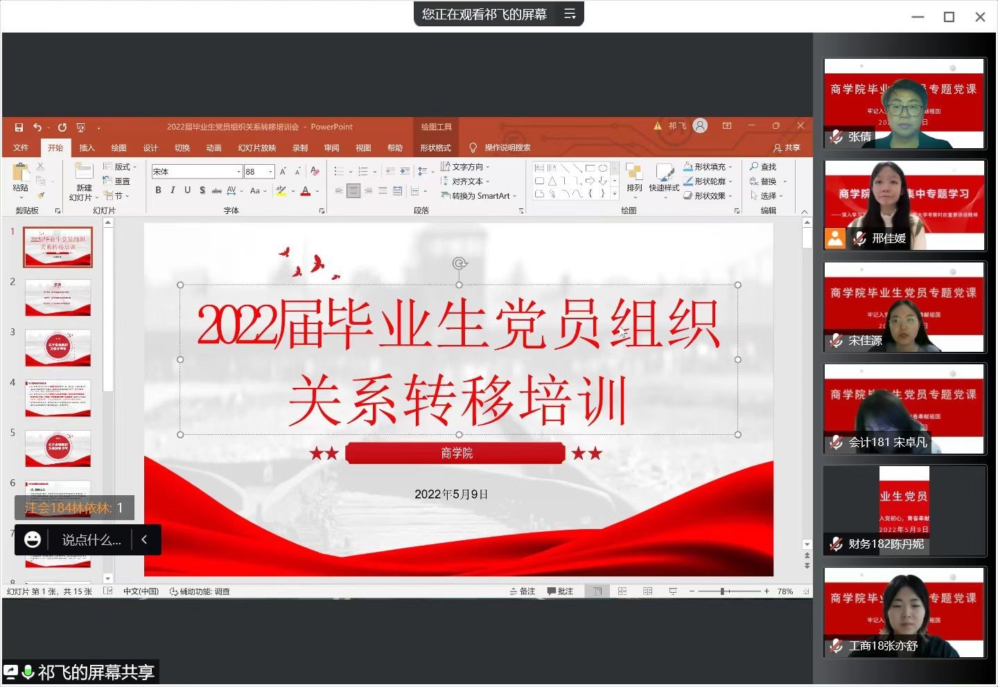 為加強(qiáng)對畢業(yè)生黨員離校前的教育,進(jìn)一步引導(dǎo)畢業(yè)生黨員在擇業(yè)就業(yè)觀念、思想價值引領(lǐng)、愛校榮校意識、崗位職業(yè)廉潔等方面發(fā)揮先鋒模范和率先垂范的作用,5月9日,商學(xué)院面向2022屆畢業(yè)生黨員舉辦專題黨課。學(xué)院黨委副書記張倩、組織員、輔導(dǎo)員及152名畢業(yè)生黨員參加會議。