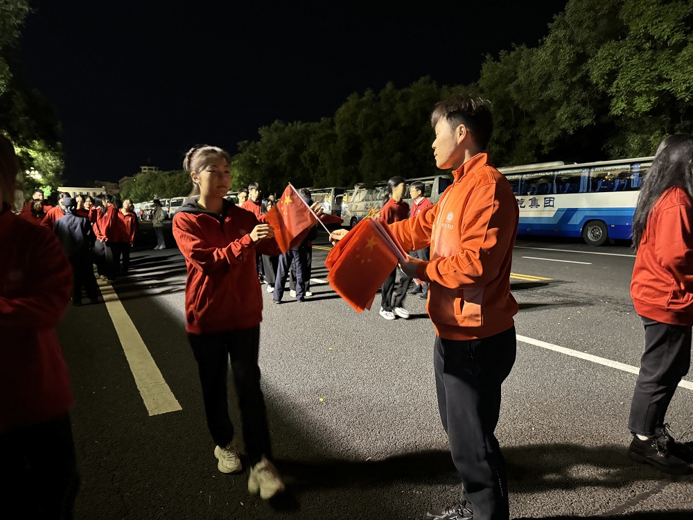 凌晨3點,一陣秋雨過后,陣陣涼意絲毫沒有減退師生們的熱情,興奮和激動溢于言表。大家乘車抵達天安門廣場,經過安檢后,手持小國旗來到指定區域就位。