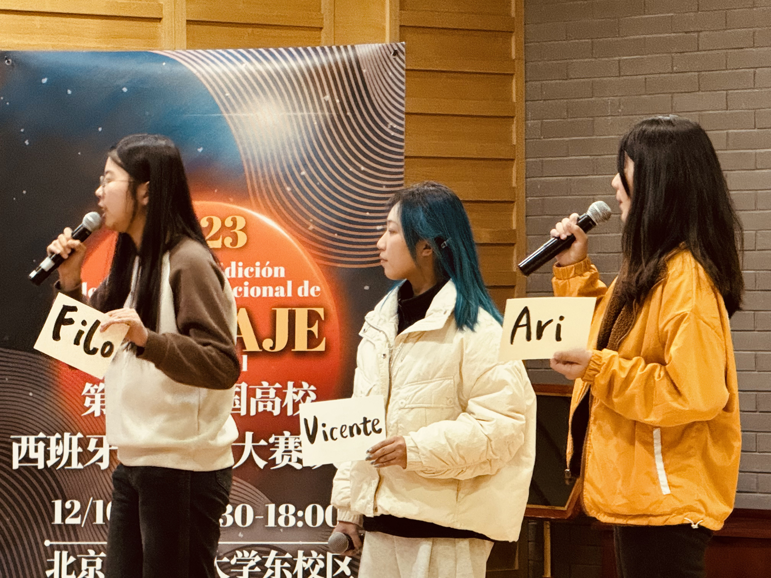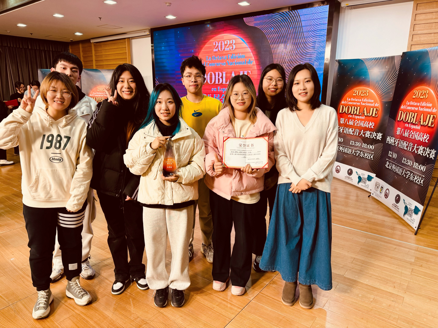 12月10日,第八屆全國高校西班牙語配音大賽在北京外國語大學拉開序幕,來自全國各地的西班牙語專業的老師帶著各自精心準備的作品齊聚一堂,在友好交流的氛圍下展開角逐。經過初賽的層層選拔,我校語言與傳播學院由西語專業周子茜、張曼琪、翟夢彤、穆依然、肖玉彪五位同學組成“成群結隊”小組,代表北京工商大學參加決賽,小語種教研室主任張馨予為指導老師,西班牙語專業教師肖云逸也到場為同學們加油助威。
