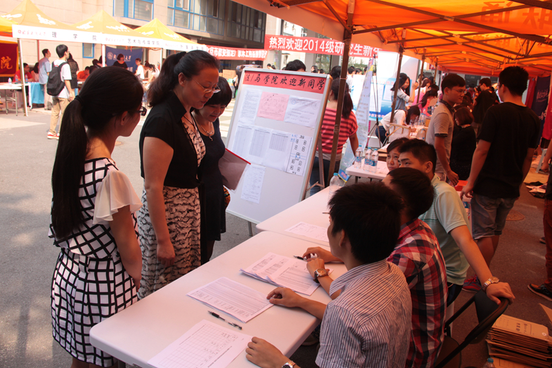 9月10日上午,法/馬學院迎接2014級新生工作在東區雙子樓下正式拉開帷幕。院長張秀芬、黨支部副書記文四英、研究生輔導員朱艷新親臨現場,統一指揮協調迎新工作。研究生會成員及部分學生干部等也齊聚迎新現場,仔細審核新生錄取通知書等重要材料,引導每一位新生順利辦理簽到、領飯卡、查詢宿舍、資料領取等一切入學手續,并耐心的對新生報到中的疑問進行講解,細心提醒新生應該注意的事項。