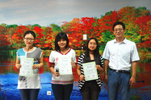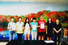 近日,2014年全國大學生英語競賽(NECCS)成績揭曉,我校榮獲全國一等獎4人,二等獎10人,三等獎22人。其中,來自商學院的肖筱童、曹蘭心、李夢遠和董子晰同學獲得一等獎。911日,外國語學院副院長苗天順及部分指導老師為獲獎同學頒發了證書。