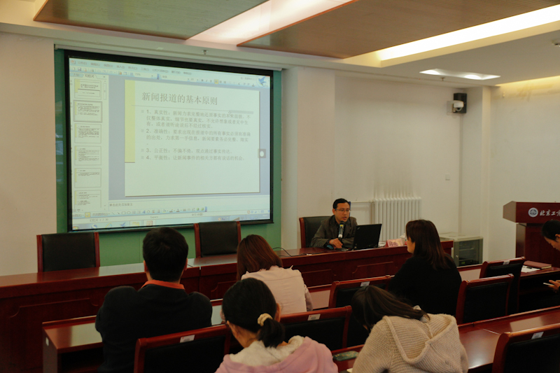 邱乾謀為大家簡(jiǎn)要介紹了新聞報(bào)道真實(shí)性、準(zhǔn)確性、公平性和平衡性的基本原則及采訪的主要方式。針對(duì)如何發(fā)現(xiàn)新聞的問題,他提出作為新聞通訊員要學(xué)會(huì)從會(huì)議、文件、活動(dòng)、調(diào)研成果、學(xué)校規(guī)章、教室、宿舍、圖書館里尋找新聞,并結(jié)合實(shí)例為大家進(jìn)行了講解。結(jié)合高校新聞宣傳需求,邱乾謀重點(diǎn)講解了消息和通訊的具體寫法和區(qū)別。他還以我校新聞網(wǎng)、后勤部門網(wǎng)站上發(fā)布的新聞為例,具體講解了如何撰寫會(huì)議新聞、校園活動(dòng)報(bào)道,如何挖掘新聞價(jià)值及新聞圖片的選擇等內(nèi)容。