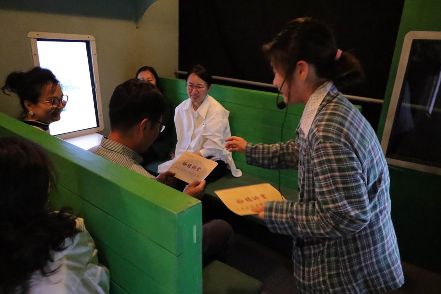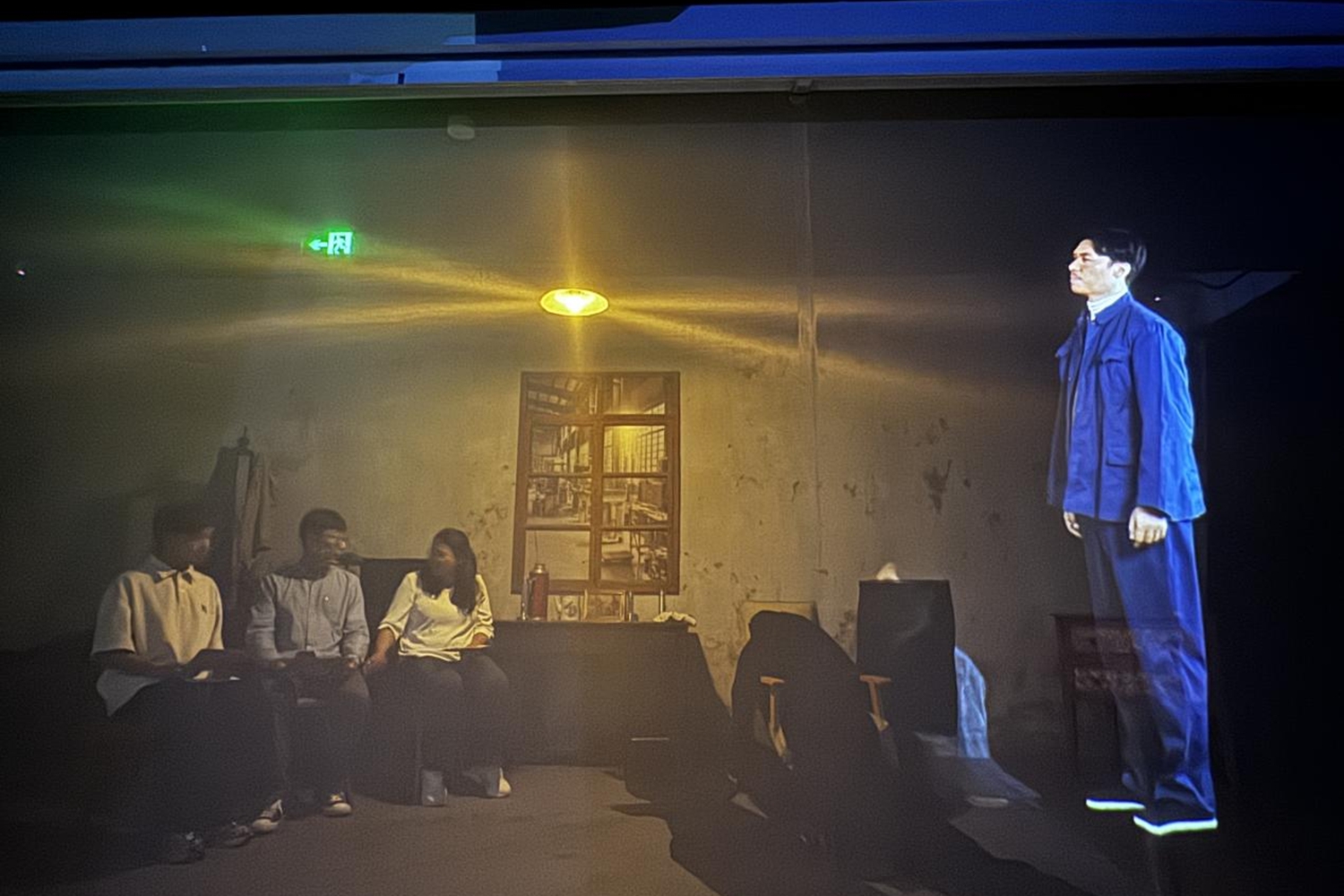 在“沉浸式”黨課《足跡》體驗環節中,在聲光電多媒體互動系統支持下,教學內容以全景方式鋪陳展開,師生們不僅能夠視覺、聽覺同步沉浸,還通過劇場式互動設置,親身參與到劇情之中——成為焦裕祿同志的同事,在不同身份視角中切身體會他為治沙治澇、排鹽種樹、走村訪戶所經歷的艱辛與信仰。當教學場景定格于焦裕祿手捧黃土、頂風踏雪深入沙丘調研的畫面時,一句“吃別人嚼過的饃沒味道”回蕩在空間中,震撼直抵人心。