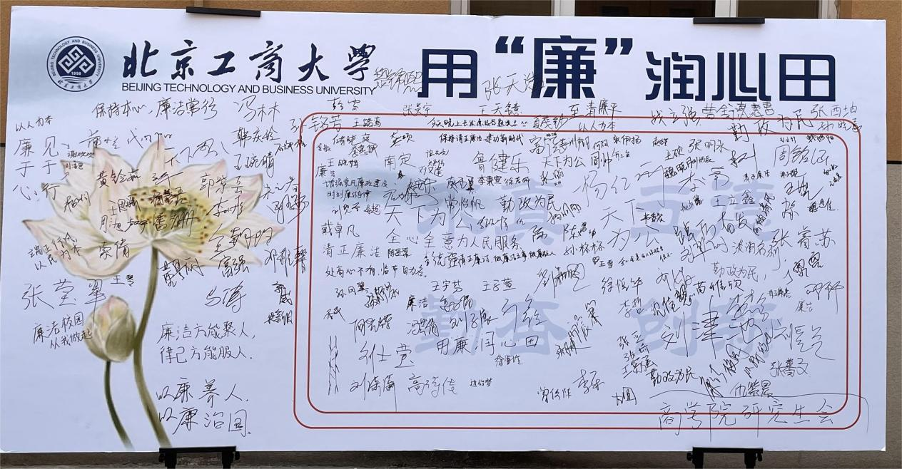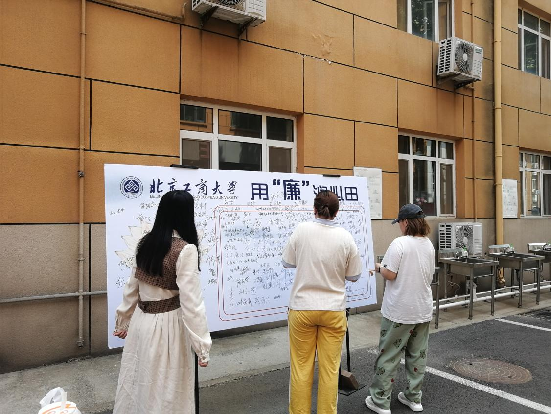 為營造良好的校園廉潔文化,商學院研究生會于5月14日11:00-13:00在阜成路西校區食堂門口舉辦“清風扶正氣 廉潔伴我行”廉潔承諾簽名活動。此次活動是商學院開展學生廉潔主題教育系列活動之一,共吸引了來自商學院、國際經管學院、輕工科學技術學院、生態環境學院等7個學院、180余名同學積極參與。