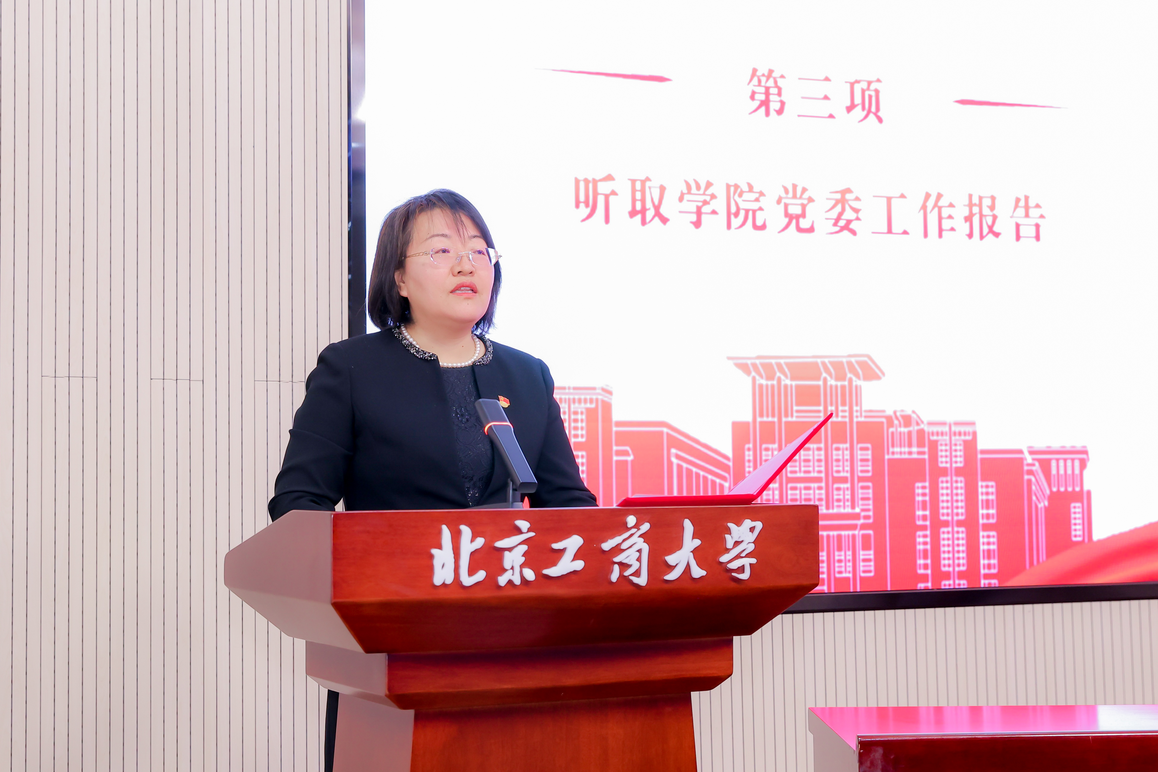 郭建華向大會致辭,代表學校黨委對大會的召開表示熱烈的祝賀!他對學院發(fā)展成績給予充分肯定,激勵師生黨員奮楫揚帆、勇?lián)姑瑢W院黨委提出四點希望:一是充分發(fā)揮黨建引領(lǐng)作用,旗幟鮮明講政治,提升黨建工作質(zhì)量,為學院事業(yè)高質(zhì)量發(fā)展提供堅強保障;二是堅決落實立德樹人根本任務(wù),貫徹教育大會精神,強化教育家精神引領(lǐng),培育教師隊伍,把握數(shù)字化機遇,堅持“工商一體化”發(fā)展,培養(yǎng)擔當民族復(fù)興重任的復(fù)合型創(chuàng)新人才;三是堅持內(nèi)涵特色發(fā)展,堅定走教學科研型學院的道路,把握數(shù)字化時代學科發(fā)展的契機,加強人才梯隊建設(shè),爭創(chuàng)“雙一流”學科,服務(wù)和支撐新時代首都建設(shè);四是持之以恒推進全面從嚴治黨,統(tǒng)籌好高質(zhì)量發(fā)展和高水平安全,壓緊壓實保密工作責任,營造風清氣正的政治生態(tài)。