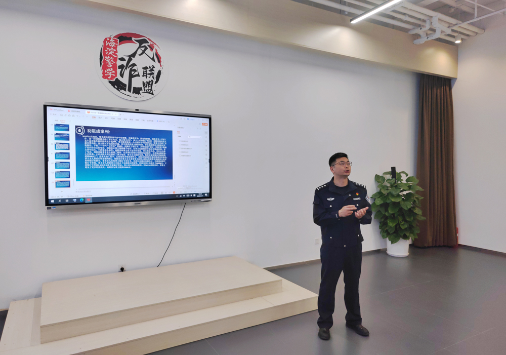 海淀公安分局高校內保支隊民警陸澤山、曙光派出所反詐預警勸阻專員李鵬以“詐騙類型與話術識別”為主題,為同學們講述反詐知識“第一課”。通過民警講述,同學們了更加直觀地了解了“刷單返利”“虛假投資”等常見詐騙類型,并通過下載安裝國家反詐中心APP主動學習反詐技巧。之后,研究生們在民警帶領下參觀了調解勸阻室、警民照片墻等場所,其中“詐騙話術創意海報”以詼諧幽默的方式形象揭示詐騙套路,引發大家駐足觀看并深度討論。