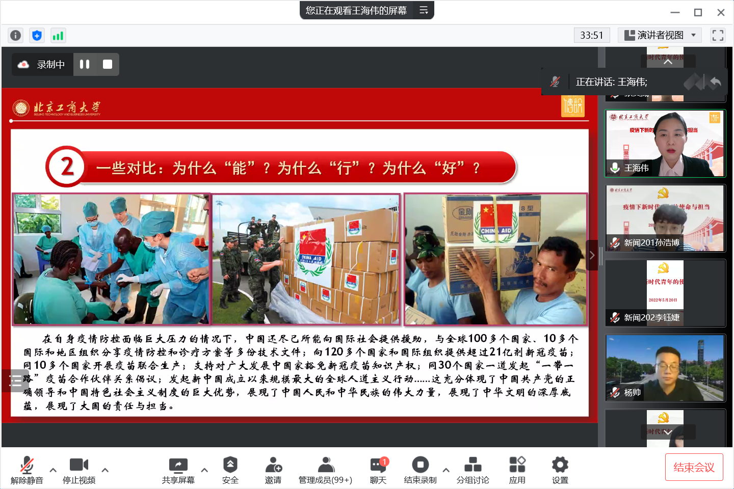 王海偉以《疫情下新時代青年的使命與擔當》為題,從目前疫情防控整體形勢分析出發(fā),圍繞疫情防控中的一些記憶、對比、啟示與思考等四個方面講授。她表示新冠病毒疫情防控攻堅戰(zhàn)是一場現實的思政課,一堂鮮活深刻的思政課,也是一堂難忘的思政課。她帶領師生共同回顧了疫情防控以來學院師生主動投身校內外抗擊疫情的生動事跡,充分彰顯了學院師生黨員的責任與擔當。提醒師生居家學習工作期間保護好自己和家人,呼吁師生們要堅定信心,自覺在思想上、政治上、行動上與黨中央保持高度一致。通過與國外抗疫數據對比,指出我國動態(tài)清零的疫情防控政策,最大限度的保護了人民群眾人身財產安全,是人民至上,生命至上的最好詮釋,體現了黨始終把為中國人民謀幸福,為中華民族謀復興作為自己的初心使命,充分彰顯了黨領導的政治優(yōu)勢和中國特色社會主義制度的顯著優(yōu)勢。