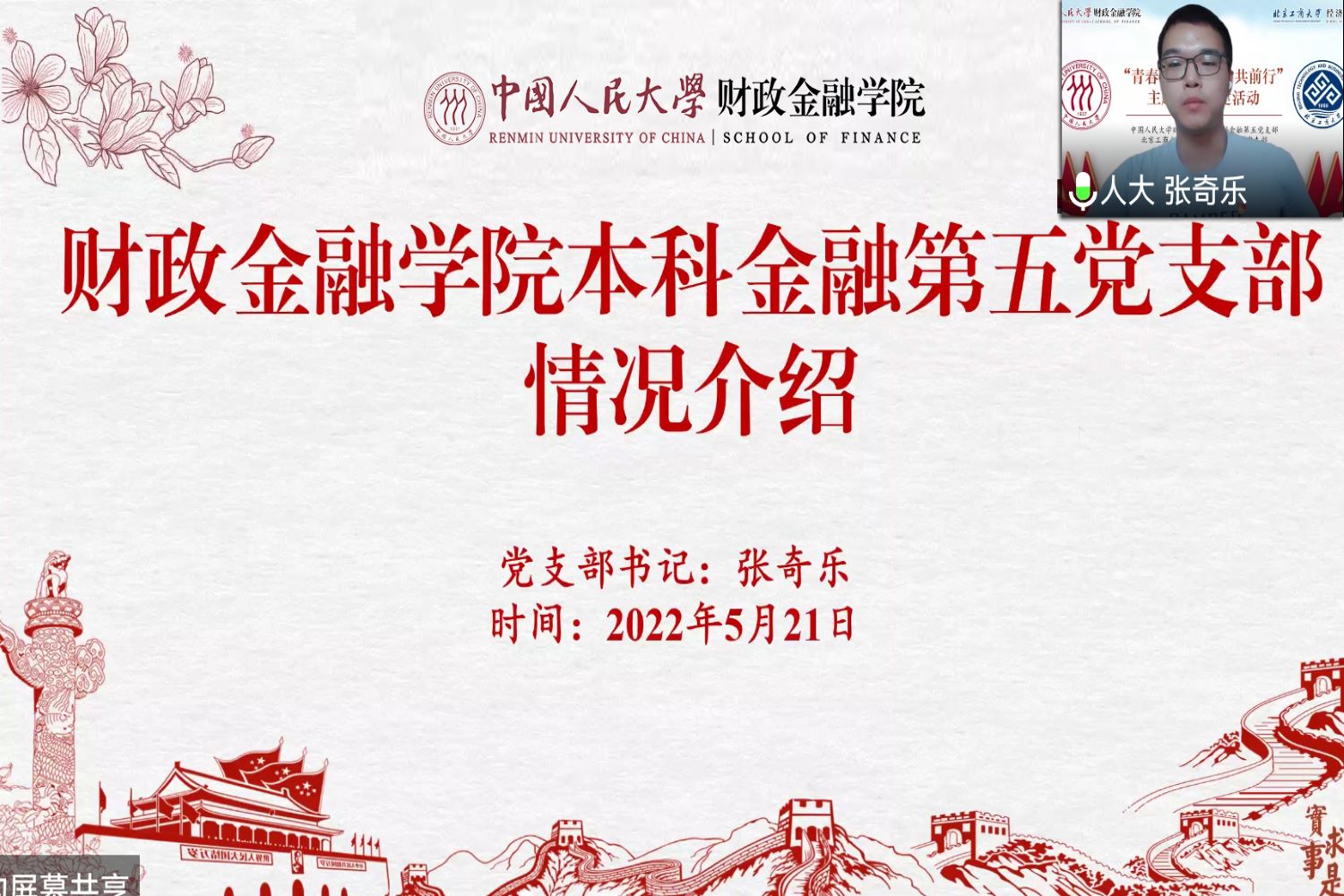 本次聯學共建活動共分為“踔厲奮發勇擔當”、“建團百年正青春”和“黨建領航聚合力”三個篇章。我校經濟學院金融本科生黨支部書記王馨笛與中國人民大學財政金融學院本科金融第五黨支部書記張奇樂分別介紹了各支部的人員組成、建設現狀與未來目標。