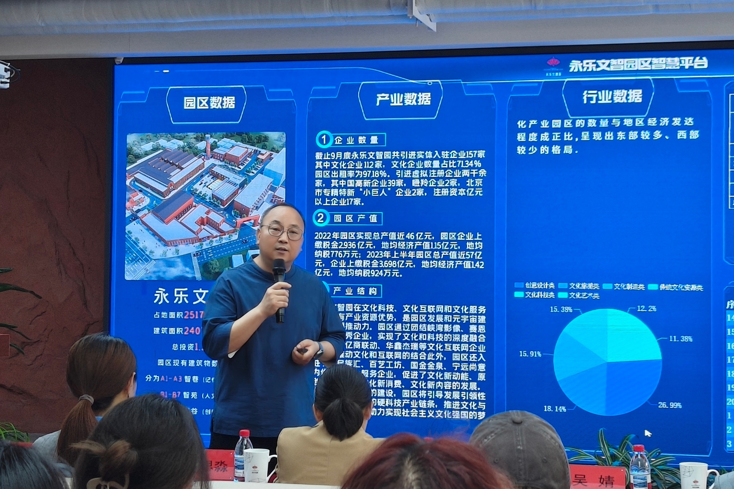 學(xué)校師生走進(jìn)永樂文智園黨群服務(wù)中心,通過觀看產(chǎn)業(yè)園發(fā)展宣傳片等了解發(fā)展情況。永樂文智園總經(jīng)理黃玲海通過園區(qū)大數(shù)據(jù)平臺,系統(tǒng)介紹了園區(qū)入駐企業(yè)以文化傳媒類為主的特點(diǎn),強(qiáng)調(diào)了產(chǎn)業(yè)園可為專業(yè)學(xué)生提供的對口資源服務(wù)。他指出,園區(qū)以“三文生態(tài)”產(chǎn)業(yè)圈為核心,未來將依托“元宇宙孵化器”等平臺,與高校在數(shù)字文創(chuàng)、智慧園區(qū)管理等領(lǐng)域開展深度合作,實(shí)現(xiàn)資源共享、技術(shù)互通。