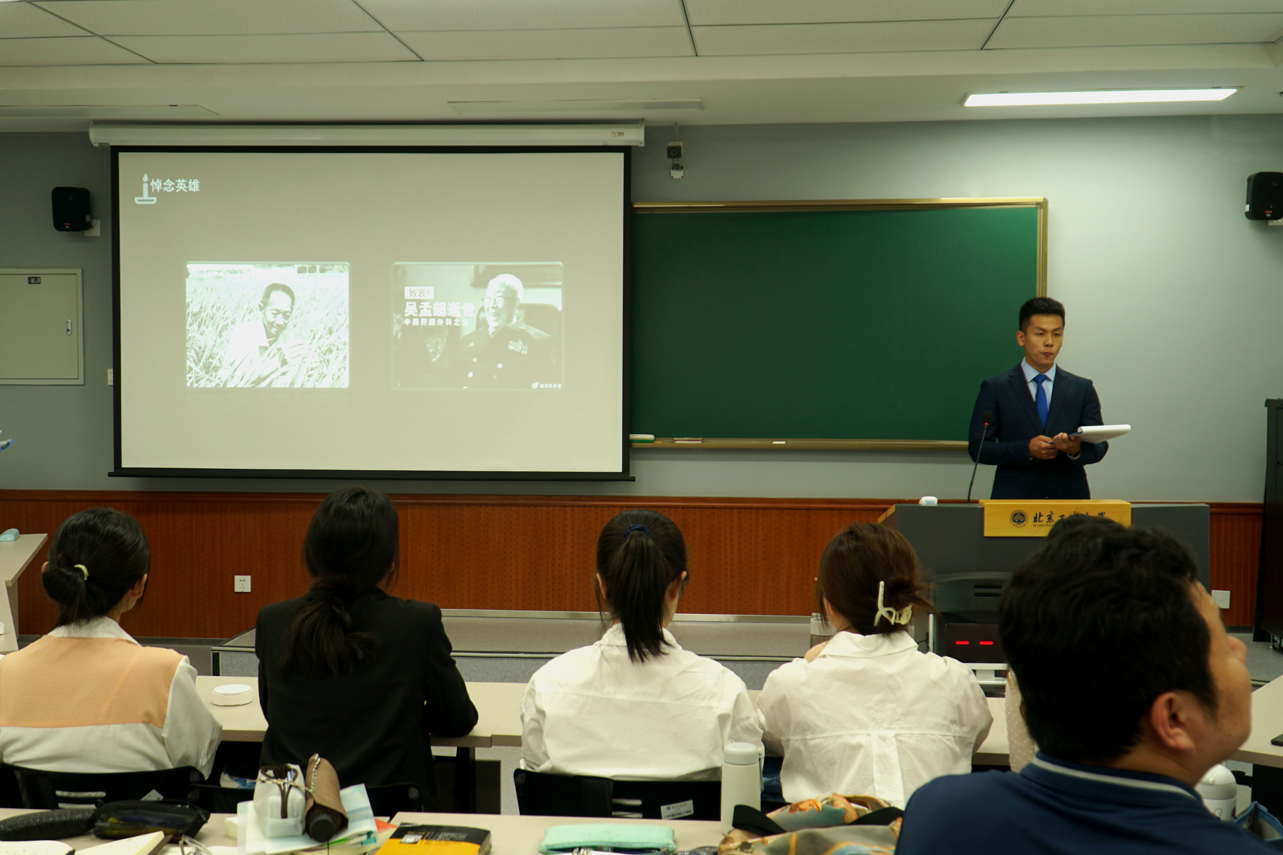 學院黨史學習教育宣講團成員韓宙延做題為《戎裝下的鐵血年華》的宣講。他講述了十位解放軍史上的英模以及吳孟超院士和袁隆平院士的感人事跡。在新中國的征程中,有無數的英雄烈士用自己的生命,書寫了祖國的繁榮昌盛。“核彈筑夢人”林俊德院士用一生見證了中國國防的發展,袁隆平院士用雜交水稻解決了世界上大多數窮苦大眾的溫飽問題,吳孟超院士在肝膽外科領域鞠躬盡瘁,讓眾多病患遠離病痛。英雄的生平,是國家的發展史,也是后人的榜樣。參會人員集體默哀,送別吳孟超院士和袁隆平院士。